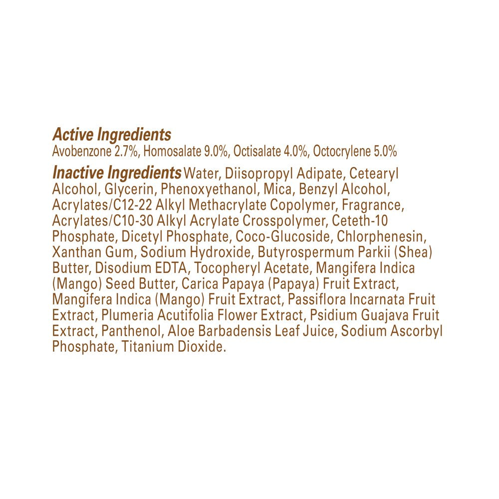 | Features | Broad-spectrum UVA and UVB sunscreen, REEF SAFE, made without oxybenzone and octinoxate, OIL-FREE & non-greasy, Contains VITAMINS C & E and MANGO FRUIT extract and a SHEA BUTTER complex |