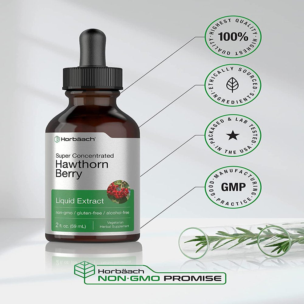 What is Hawthorn Berry? Hawthorn Herb, a member of the Rose Family, is rich in beneficial flavonoids and has a long history of use to support a wide-variety of wellness initiatives.* It's derived from a genus of several hundred species of trees native to temperate regions of Europe and North America. Hawthorn is revered for its beautiful white flowers and tart tasting fruit that bloom from its bushes. It has become a popular herbal supplement because of its strong antioxidant value.* How to get Hawthorn Berry: There are a variety of products that feature the extracts of this incredible plant. Some best-sellers include: Hawthorne capsules, liquid syrup, dry tea leaves and tea bags, root powder, pills, essential oil and even fresh jelly/jam! However, there is a simple and more effective way to reap the health & wellness benefits of this succulent superfood. About Hawthorn Berry Extract: Looking for the best direct source of this potent herb? Horbaach now delivers this beneficial ingredient in a super-concentrated, alcohol and sugar free liquid extract. Each tincture delivers convenient drops that blend perfectly with water, juice or a cozy Hibiscus Tea. Add this must-have extract to your collection of vitamins and herbs and enjoy daily!