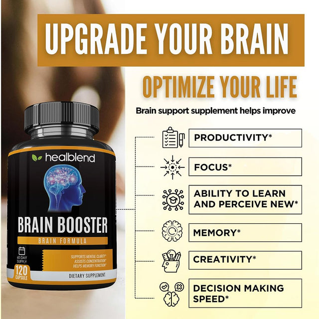 Healblend Brain Booster Supplement, Supports Cognitive Function & Mental Clarity, Improve Concentration & Alertness, Vitamin B12, Ginkgo Biloba, Dmae, Rhodiola, Alpha GPC, 120 Capsules Want your brain to be functioning in the most efficient way possible? You need to get our Brain Booster Supplement. This dietary supplement delivers what the brain needs in the form of effective ingredients that work within the bio-pathways to help improve a variety of cognitive functions. It will help boosts all the aspects of human cognition. The supplement works best for those who have an active lifestyle that demands dynamic brainpower. It boosts productivity and work-performance so that you can come up with creative solutions for your problems and multi-task easily even under stress. This brain booster is specially Formulated to increase neurotransmitters, brain circulation, mental performance, and better function, supports energy of brain as well as the body, and recall and cognition, improves sleep as lack of sleep affects mood, and brain function.
