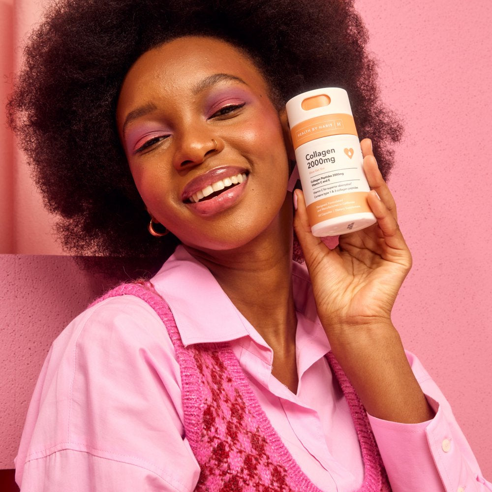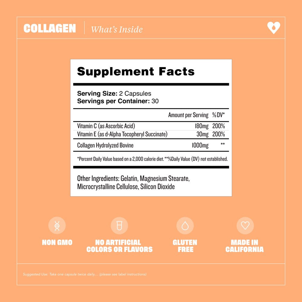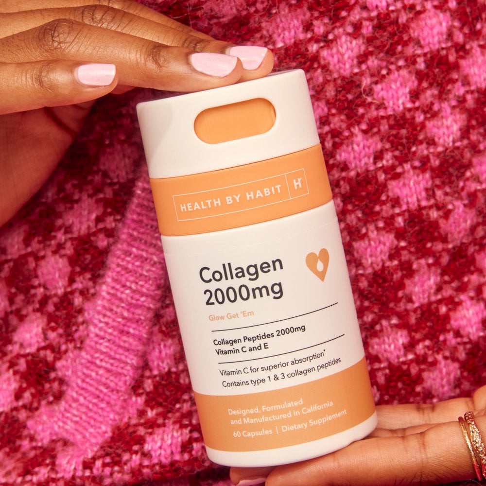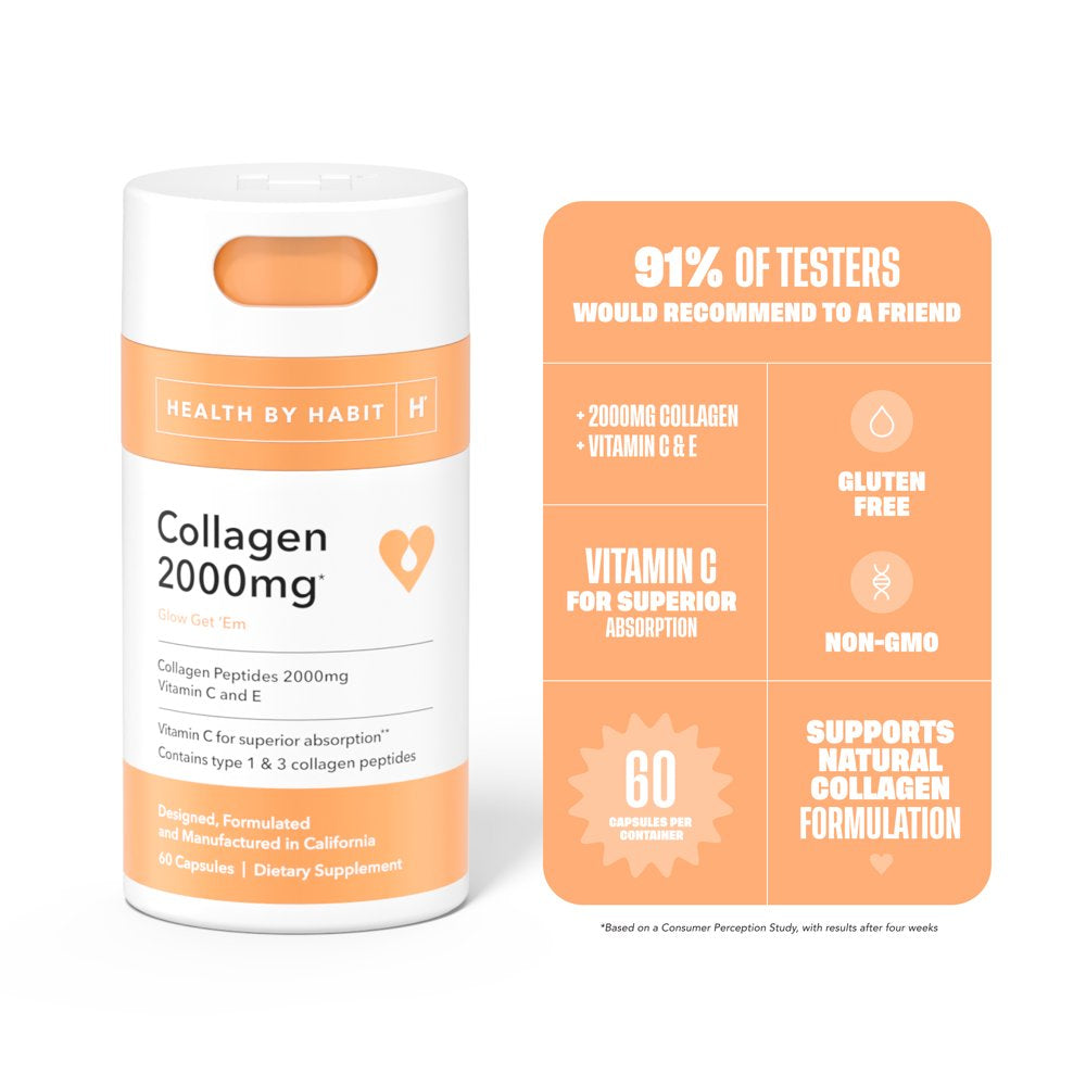Glow get 'em, with our sustainable Collagen 2000mg blend to support the body’s natural collagen production. They say beauty comes from within, and with 2000mg of type 1 and type 3 Collagen Peptides, Vitamin E, plus Vitamin C for superior absorption*, this specially formulated blend will have you feeling good from the inside out. What’s more, our Collagen is sustainably farmed and comes from grass-fed sources for the ultimate guilt-free glow. With no artificial colors, flavors or sugar, Collagen 2000mg is non-GMO and designed, formulated and manufactured in California. Contains 30 servings per pack. For full instructions, see back of pack. Discover the power of habit and #DOITDAILY MVP supplements Collagen Peptides 2000mg Vitamins C and E The Power of Habit at Health by Habit we know maintaining your health is hard enough, so we don’t overcomplicate it. We’re democratizing wellness by making products that are affordable, accessible and straight-forward. That do what they say on the label. To do that, we consult a research and development team of scientists and nutritionists, with decades of experience and a wealth of knowledge. With Health by Habit you get clever, concentrated formulas that work incrementally to make you feel like yourself… but better. Because we know you’ve got bigger things to achieve, we make it easy to get it done daily and get on with your life. *These statements have not been evaluated by the Food and Drug Administration. This product is not intended to diagnose, treat, cure or prevent any disease.