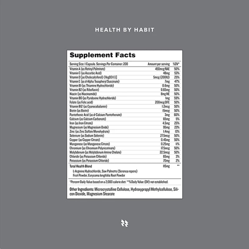 Health by Habit Vitamins Capsules Men's Multi 200ct Our Men’s Multi is a male multivitamin designed to support general health and wellness—and help you go the distance—with 23 essential vitamins and minerals such as Vitamins A-E, Calcium, Iron, Magnesium, Potassium and Zinc, plus a Total Health Blend containing L’Arginine and Saw Palmetto.