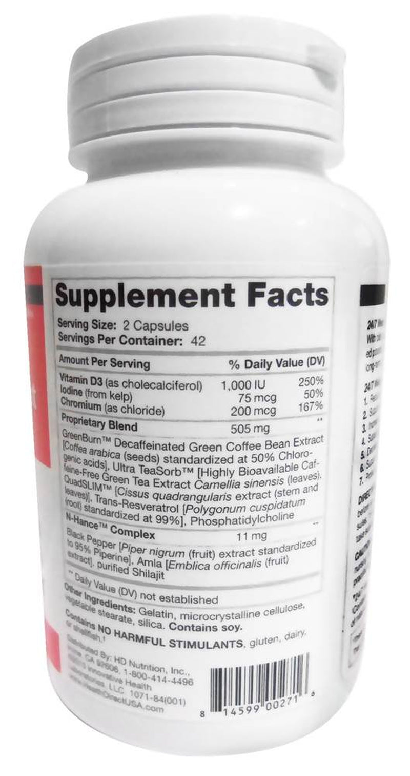 24/7 Weight Loss™ is a comprehensive 7-in-1 anti-aging weight loss supplement. With diet and exercise it helps you maintain a healthy weight and even reduce unwanted pounds safely, without any harmful stimulants. 24/7 Weight Loss can be used long-term, on a daily basis, to support a more youthful, trim body. 24/7 Weight Loss’s ingredients are shown in both in vitro and in vivo clinical studies to: #1 Reduce body fat stores #2 Support healthy hormone levels #3 Increase metabolism #4 Support satiety and help control emotional eating #5 Decrease the digestion and absorption of sugars, starches and fats #6 Support healthy blood sugar and insulin within normal levels #7 Protect cells with high ORAC antioxidants..