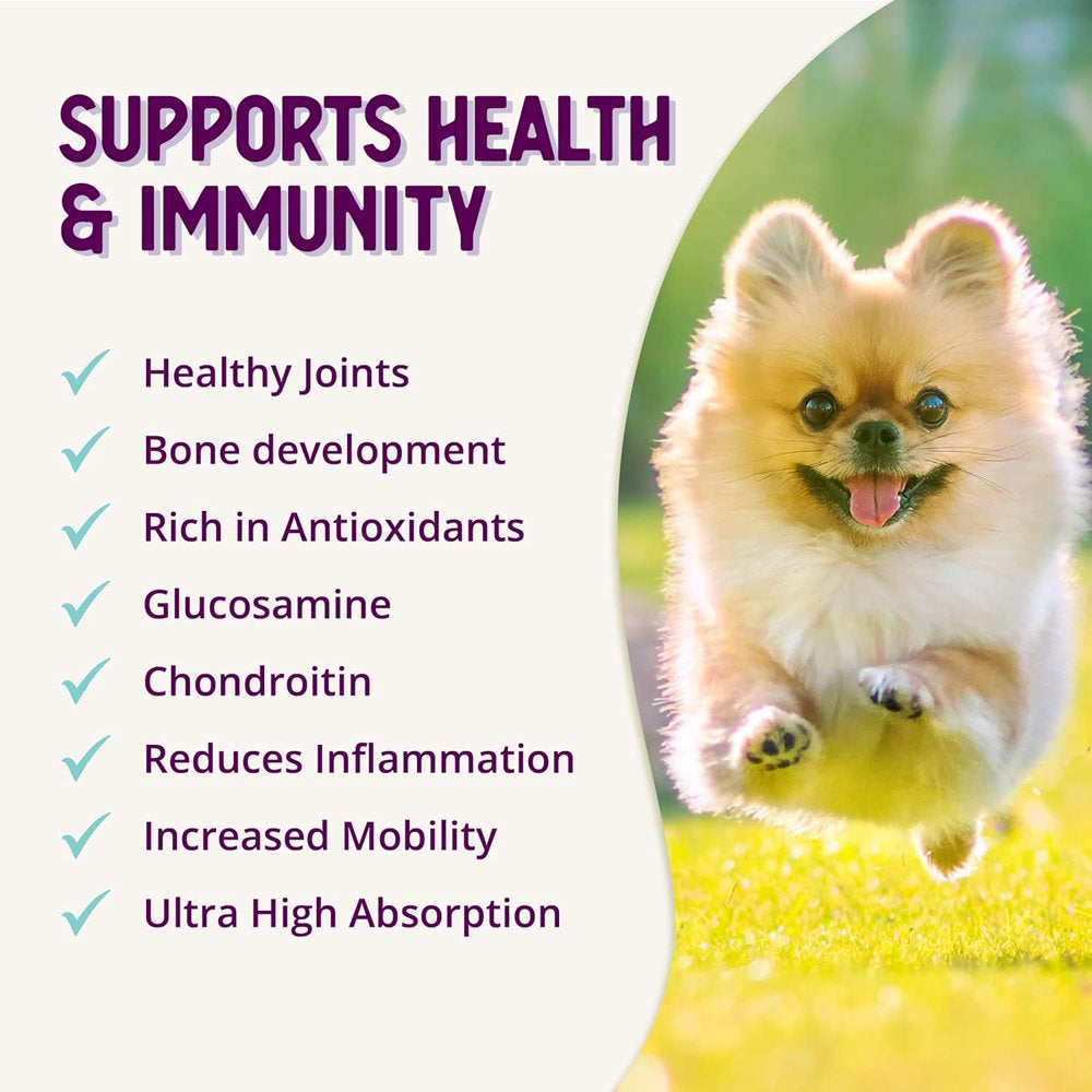 All natural joint support for dogs. Easily applied to food in powder form. Also contains naturally occuring vitamins to promote overall health.