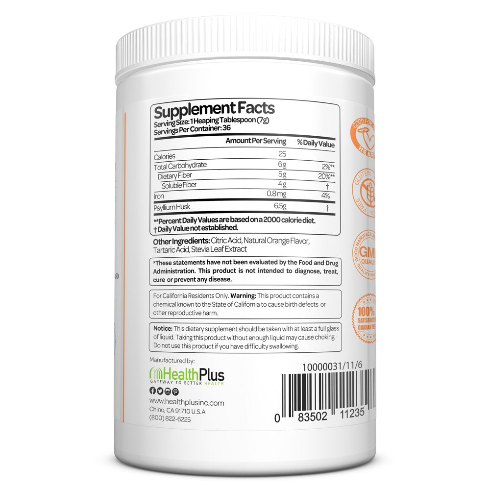 The Health Plus Colon Cleanse Orange Sugar Free is made with Psyllium Husk Fiber and supplies the body with 20% of the recommended daily values of dietary fiber per serving. The benefits of this cleanse include helping maintain regularity and cholesterol levels, aiding with occasional constipation, promoting heart health and allowing you to truly feel fuller longer. Using only the finest Psyllium Husk, this trusted product can be taken daily. For even better results, consider combining this cleanse whenever possible with other components of a truly healthy lifestyle, which include sufficient exercise, plenty of water, and a sensibly-balanced diet which suits your daily needs. This product comes in 9 ounces - 36 servings. For more than 30 years, Health Plus has been committed to developing and manufacturing the highest quality supplements available. To this day, they remain committed to their roots by offering a full range of innovative products that support healthier lifestyles and overall wellness. After all, a healthy outside starts from the inside, so all Health Plus products are formulated using raw, high-quality ingredients in their many varieties of healthful cleanses, fibers, flavors, recipes and more. Inspired by purpose and driven by passion, Health Plus is raising the bar to a gateway for better health.