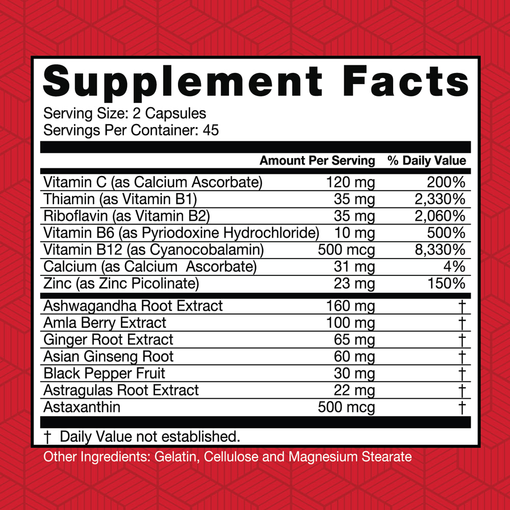 - Included: Ashwagandha, Amla Berry, Ginger Root Extract, Black Pepper Fruit