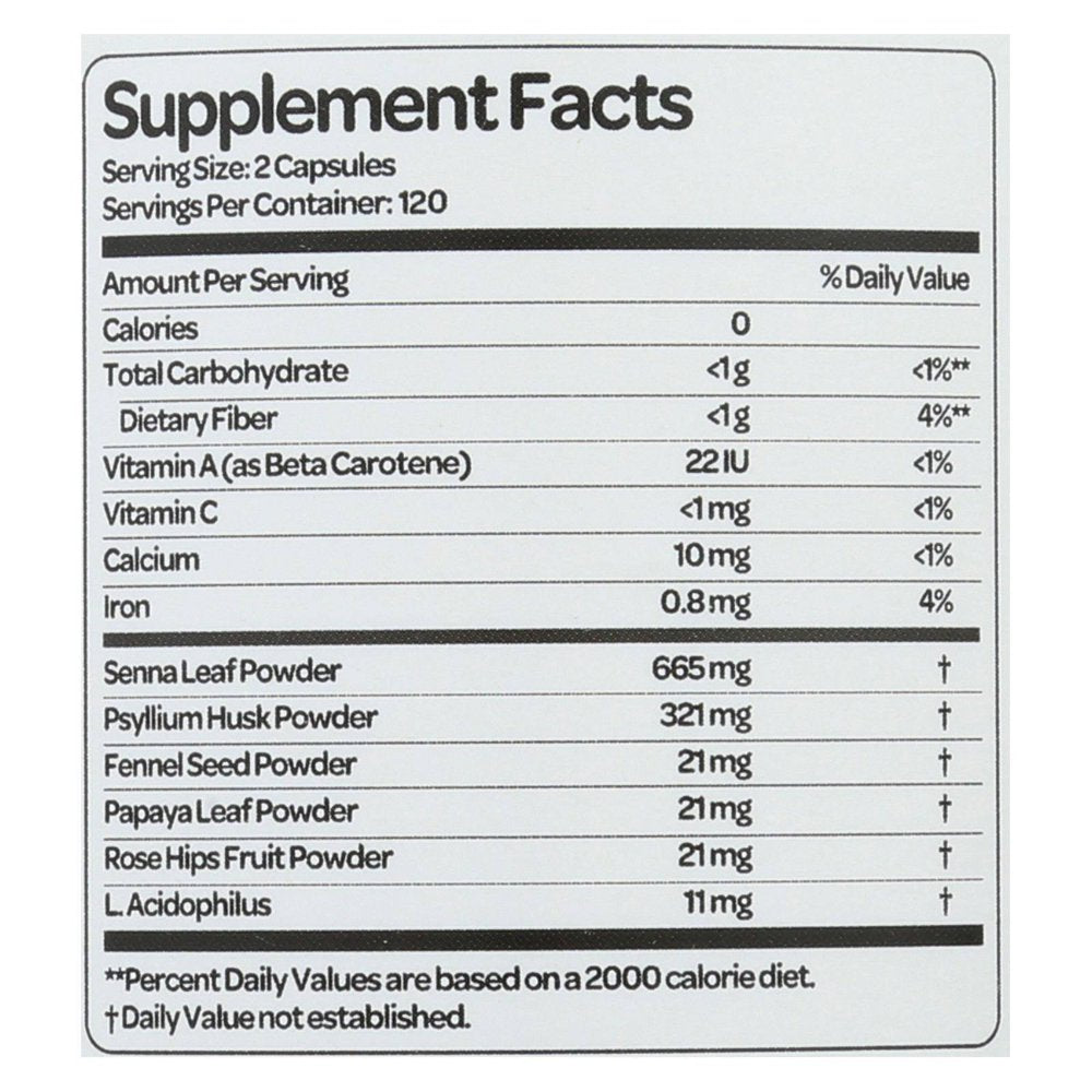 Ingredients:Psyllium husk powder, senna powder, fennel seed, peppermint, papaya, cascara sagrada, rose hips, buckthorn bark, barberry root, celery, and acidophilus.
