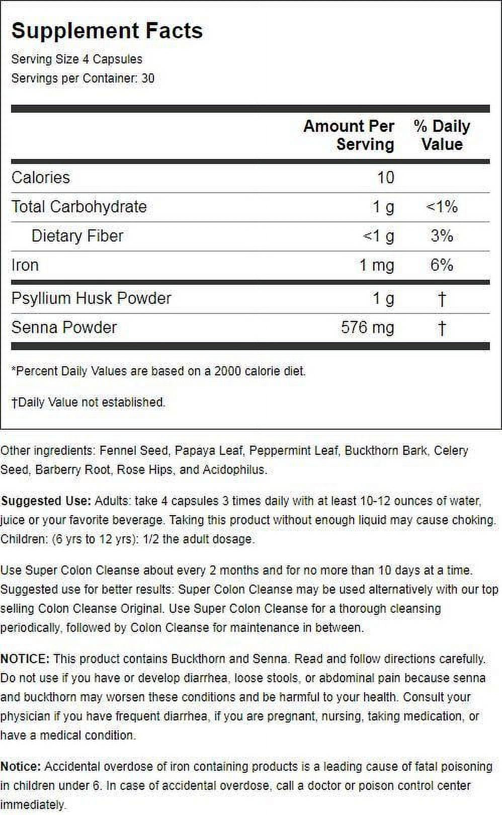 When you need a quick and effective detox, don’t worry, we’ve got you covered!* Super Colon Cleanse has been a staple in households since the 90s. This time-tested formula is perfect for occasional use when you need a little help to “go”.* Poor diet, stress, fatigue, and environmental toxins all contribute to limiting your body’s ability to manage waste and regulate digestion. Super Colon Cleanse is a gentle formula filled with herbs that aid in cleansing the intestines to rid the body of built up waste, provide good gut bacteria, and optimize digestive processes.* Includes the natural stimulant, Senna Leaf and soluble fiber, Psyllium Husk, Super Colon Cleanse may help with occasional constipation, eliminate toxins, improve nutrient absorption, rehydrate the body, and support weight loss.