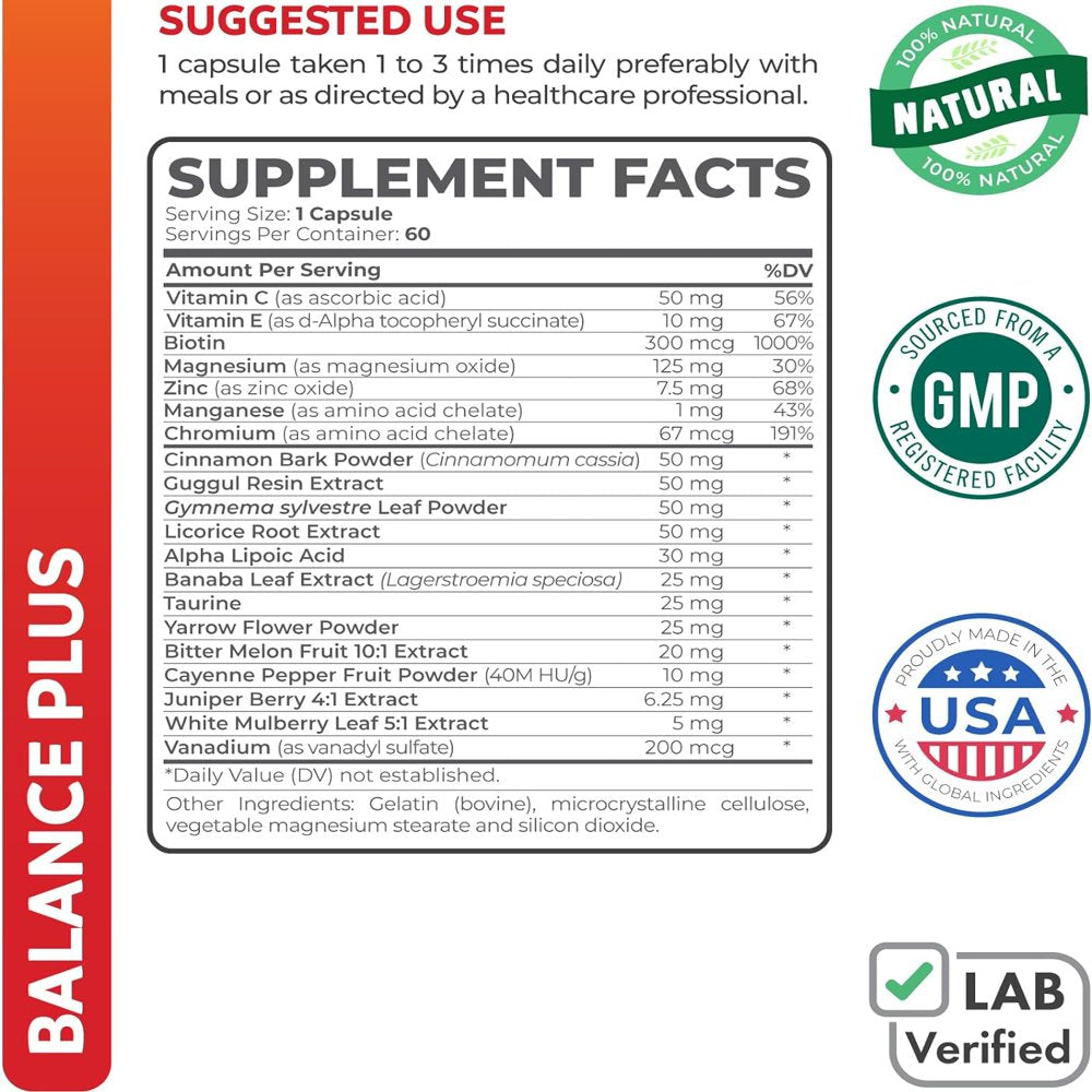 An advanced formula including targeted Vitamins (Vitamin C, E, B7 Biotin), Minerals (zinc, magnesium, manganese, chromium, vanadium), and natural Herbal Support (cinnamon bark powder, guggul, banaba, bitter melon, gymnema sylvestre, licorice root, yarrow, cayenne pepper, juniper, white mulberry) plus ALA and taurine.