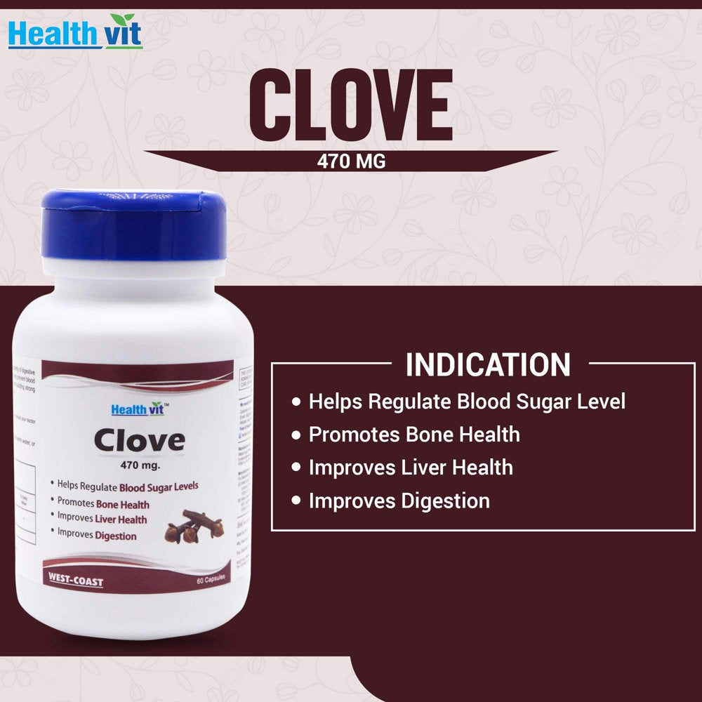 Healthvit clove 470 mg - 60 capsules. Clove can prevent constipation and promote regularity of digestive system. It may help strengthen the immune system and prevent blood clotting. It also helps maintain brain function and building strong bones, protects the liver and reduce oxidative stress. 1. Helps regulate blood sugar levels. 2. Promotes bone health. 3. Improves liver health. 4. Improves digestion. Ingredients: Clove bud powder (syzigium aromaticum) - 470 mg. Suggested use: Take 1 to 2 capsules daily with warm water or as directed by healthcare practitioner.