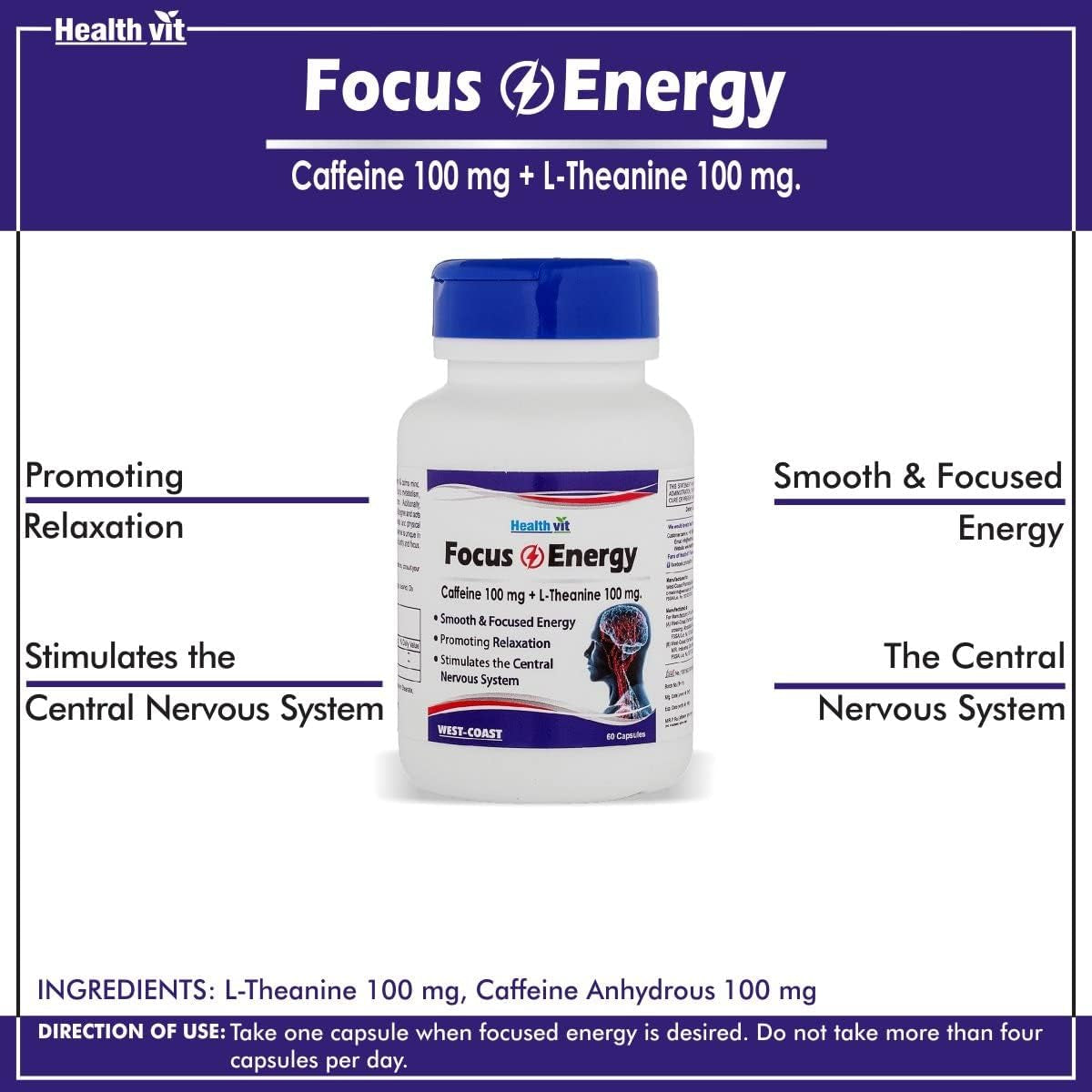 Healthvit Focus & Energy Caffeine 100 Mg + L-Theanine 100 Mg 60 Capsules