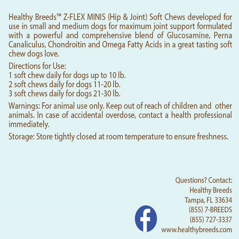 Healthy Breeds Z-FLEX MINIS (Hip & Joint) Soft Chews developed for use in small and medium dogs for maximum joint support formulated with a powerful and comprehensive blend of Glucosamine, Perna Canaliculus, Chondroitin and Omega Fatty Acids in a great tasting soft chew dogs love.