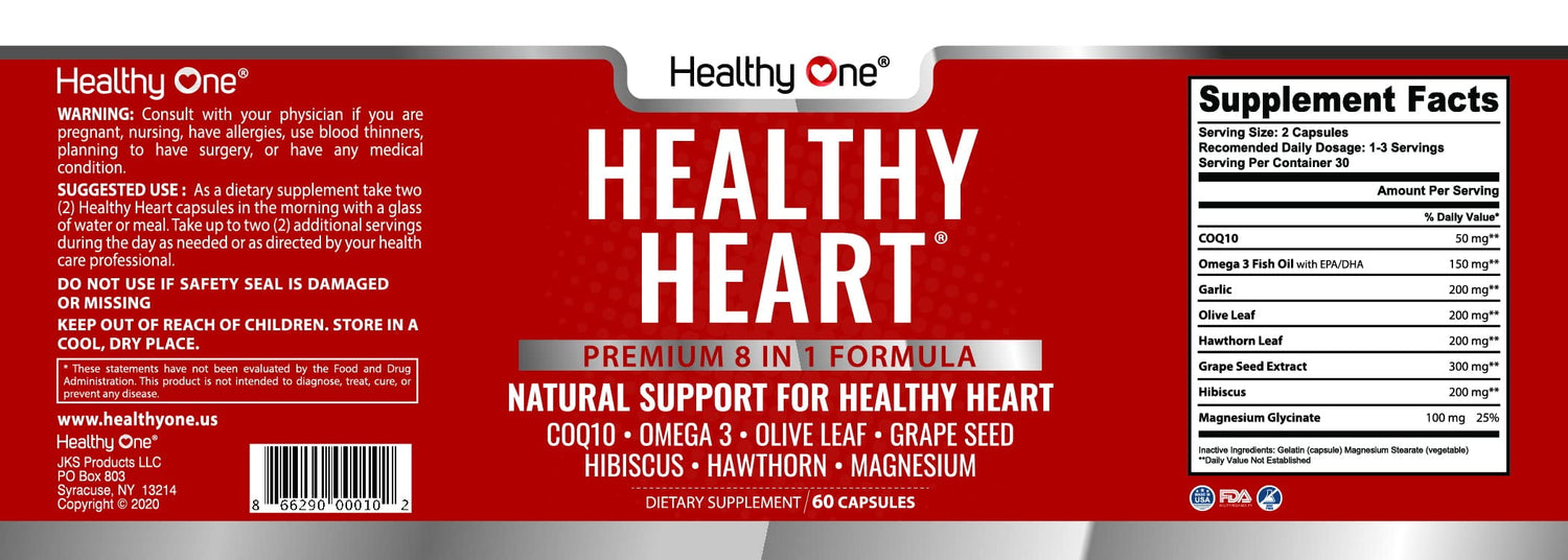 Contains 8 all natural ingredients that may help improve wellness and blood flow. Contains COQ10, Olive Leaf, Hawthorn, Grapeseed, Garlic, Hibiscus, Fish Oil and Magnesium Glycinate.
