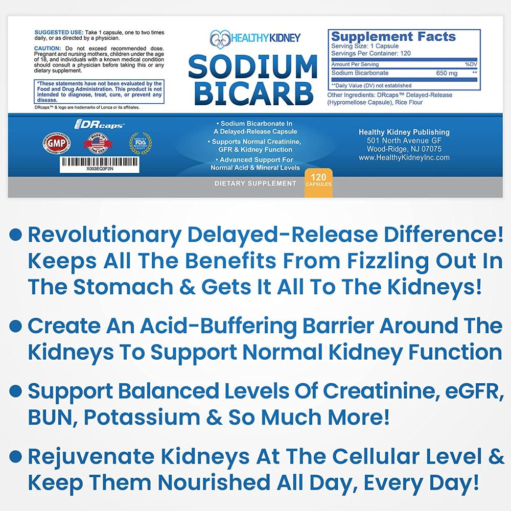 - Created by a kidney health sufferer who has suffered with excess acid. Formulated in an FDA-registered, manufacturing facility using only cGMP standards here in the USA. Every doctor says sodium bicarbonate is important for kidney health. Try our 650mg sodium bicarbonate to neutralize acid in its tracks to reduce kidney stress for maximum rejuvenation. Enjoy better kidney and whole body health.