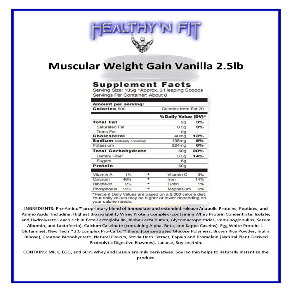 - Advanced Dietary Supplement. No artificial flavors or sweeteners. No added sugars or fats. 60 grams of muscle building protein and 5 g pure creatine monohydrate per serving plus added l-glutamine & ribose. All natural muscle gainer. Laboratory tested and assayed. Mixes with a spoon. Naturally flavored. Absolutely delicious. If you want to gain muscle mass, two of the most basic and important things you need are sufficient amount of protein and a surplus of calories. All calories are not created equal though, only calories from protein can be used by the body to build muscle. About 50% of the calories in Muscular Weight Gain 3 come from protein, most other weight gainers have a lower percentage of protein content (they have more carbohydrates and less protein because carbs are much cheaper). MGW3 gives you these extra calories and protein in a delicious and easy to drink beverage, without added junk you don't want. It is low in saturated fat and cholesterol, and free from added sugars, fats, artificial flavors, colors, and sweeteners. Muscular Weight Gain 3 allows you to put on muscle the healthy and natural way, without overloading your system with additional bulk food. The Pro-Amino multi-source protein blend contains precisely formulated quantities of whey, casein, and egg proteins and hydrolysates to yield both an immediate surge of amino acids to stimulate muscle growth, as well as a slow release of amino acids to keep the body in an anabolic state and support muscle growth for several hours. The New Tech 2.0 Pro-Carbo complex carbohydrate blend contains an array of low-sugar, slow-digesting complex carbohydrates to fuel your workouts, replenish your glycogen stores, and give you the extra calories you need to gain muscular weight. The original Muscular Weight Gain was introduced over 25 years ago and was revolutionary for a time when weight gainers were loaded with excess sugar, and were often only 25% protein. This third generation formulation represents over 25 years of product improvements and refinements, as well as the incorporation of the latest sciences and technology available for muscle gainer formulations, giving you a formulation which is both cutting edge and time tested. The name (Muscular Weight Gain) implies our product is geared for only bodybuilders and athletes. Although it was formulated with the bodybuilder and athlete in mind, the concept was to make a product that anyone can use to gain weight in a natural and healthy manner. In combination with proper exercise, MWG3 is formulated to produce a quality weight gain of lean body mass (healthy muscle tissue) and no adipose weight (unhealthy fat tissue). Many other brands available are highly saturated with sugars, excessive starches, artificial flavors and sweeteners, salt, fats, and other junk and inexpensive ingredients to boost calorie content and improve taste. Be leery of these products as these ingredients will produce a definite weight gain, but one of fat tissue, which is not healthy and a burden on your entire system (especially your heart). A scoop is included, but may settle to the bottom. (These statements have not been evaluated by the Food and Drug Administration. This product is not intended to diagnose, treat, cure or prevent any disease.) Made exclusively in the USA.