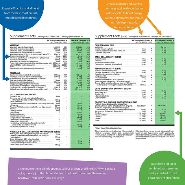 Healthycell AM/PM Nutrition Natural anti Aging Supplement for Adults, Supports Cell Health, 120 Tablets