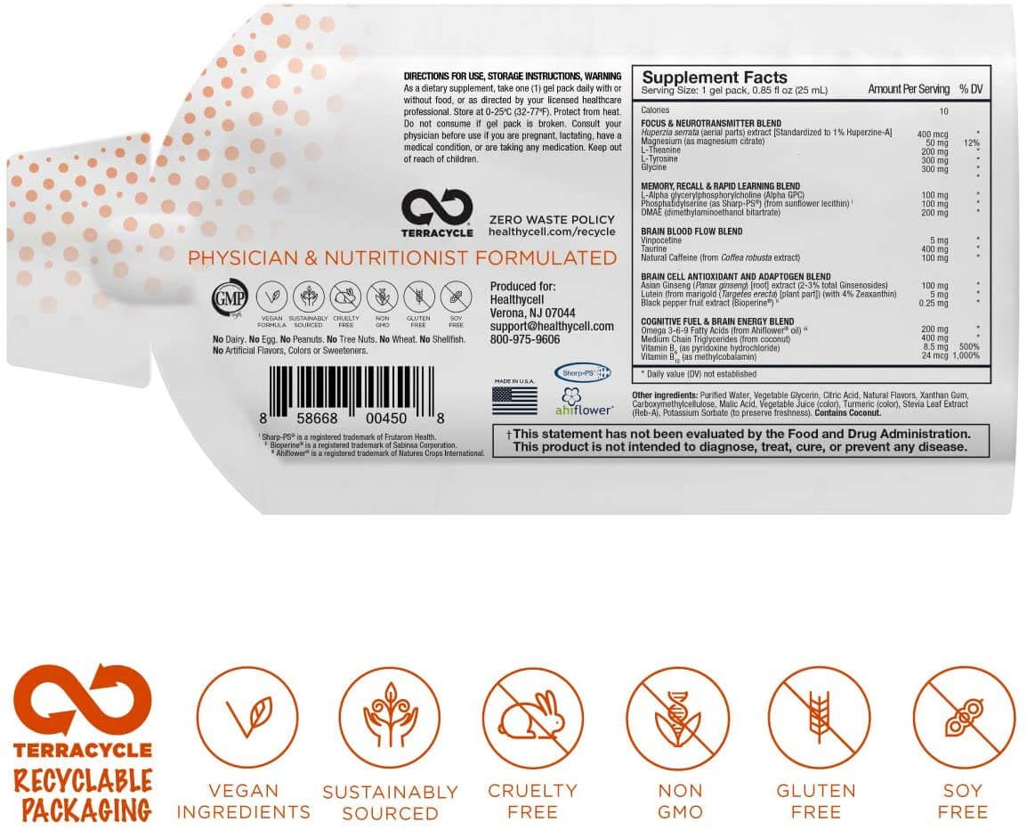 Healthycell Focus and Recall Brain Boost Nootropic Supplement for Adults, Supports Brain Health, Liquid Gel Packs (30 Count) is backordered and will ship as soon as it is back in stock.