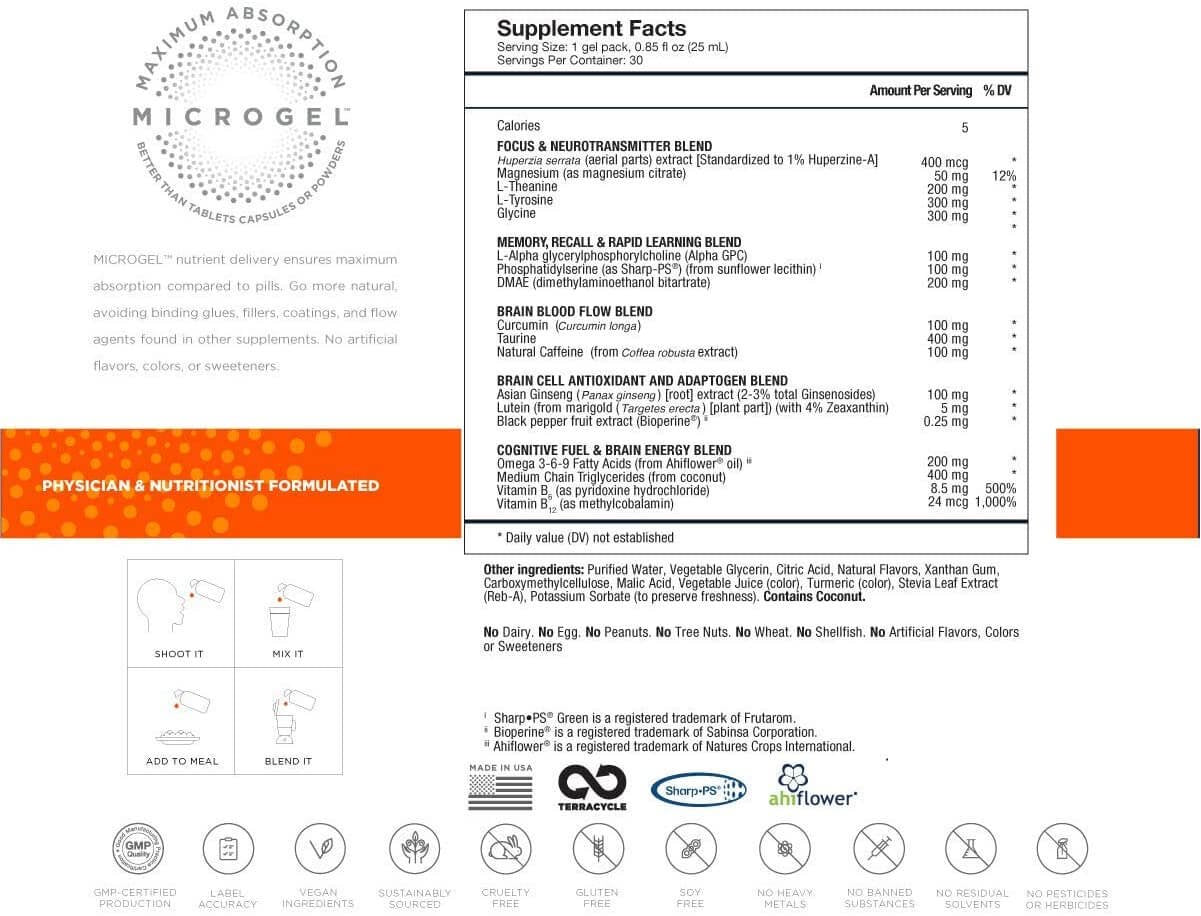 - FOCUS SHARPER: Our nootropic brain booster is packed with science-backed neurotransmitters that help avoid mental distraction for laser focus, increased productivity, concentration, mental clarity and memory recall. Contains 2,988 MG of brain-supercharging nootropics in one gel pack (equivalent to more than 6 separate pills) *