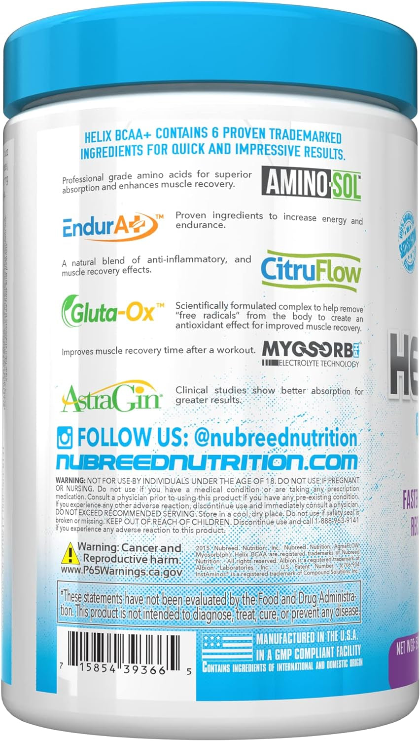 HELIX BCAA+ - “THE FUTURE OF RECOVERY”* When you train hard, the ability to recover efficiently can become compromised. When this happens and you’re too sore to get back in the gym, your progress suffers. . Since we know this all too well at Nubreed Nutrition, we designed Helix BCAA to not only accelerate your recovery and maximize blood flow but to also decrease your susceptibility to potential muscle aches and pains. HELIX BCAA+ is the evolution “Full Spectrum” BCAA /EAA’s utilizing “Vegan” fermented instantized aminos for rapid nutrient assimilation, superior bio-availability, and maximizing protein synthesis. All of this helps mitigate any catabolism and reduce potential delayed onset muscular soreness (DOMS). HELIX BCAA+ was designed to accelerate recovery and muscle growth in elite athletes by combining the highest quality of ingredients with the most scientifically advanced amino acid cocktails to catapult your athletic performance to the next level.