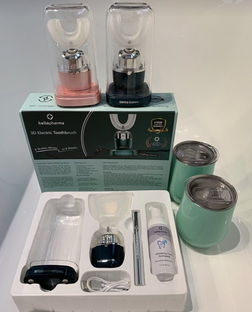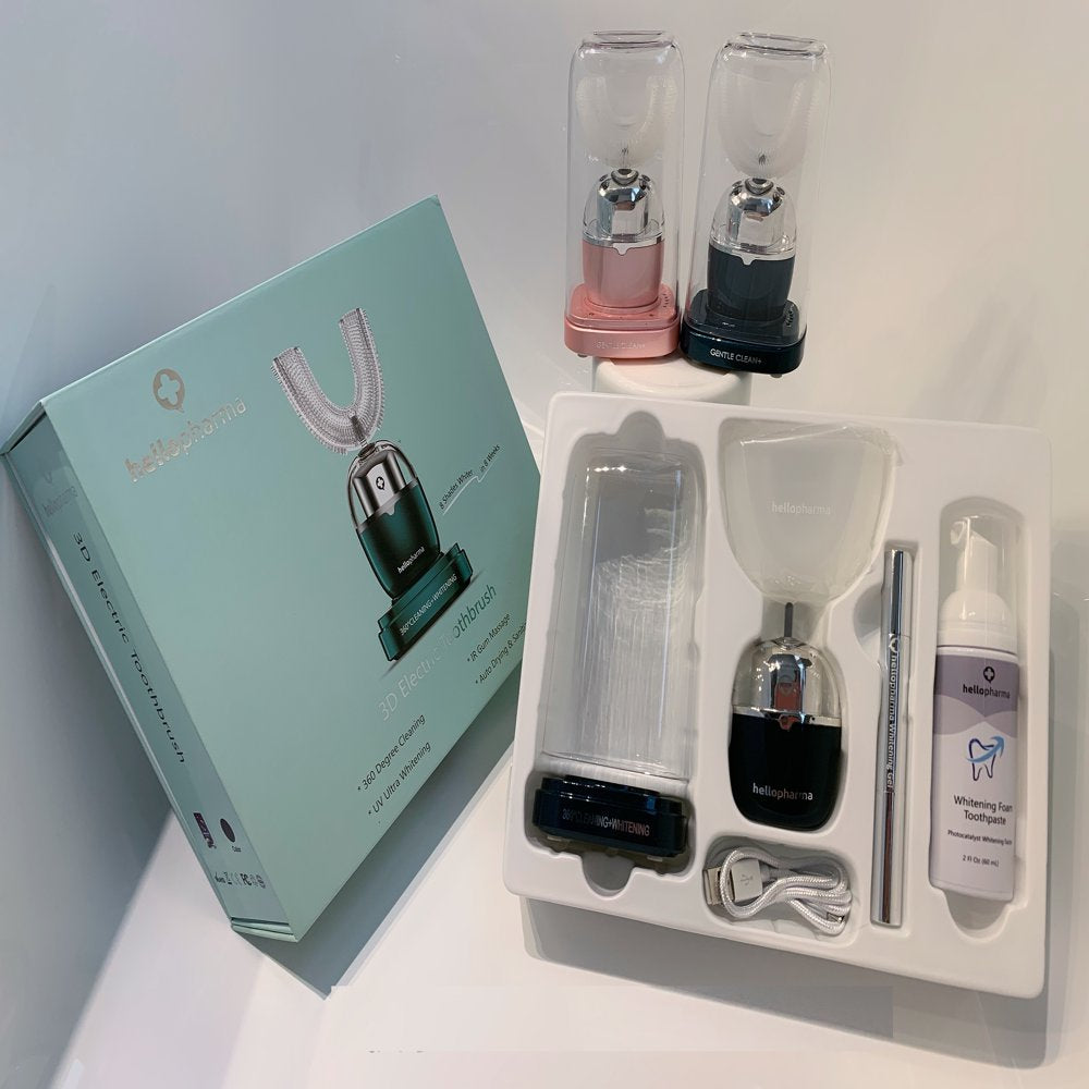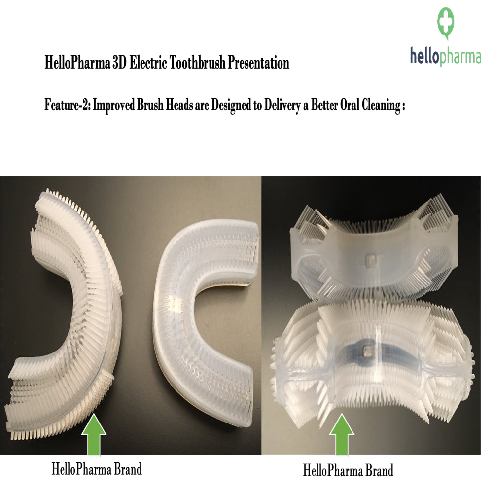 - 360 Degree sonic cleaning powered by Magnetic Levitation Motor. HelloPharma 3D Ultra UV-Whitening Electric Toothbrush is the ONLY U-shape toothbrush providing 2min brushing time.