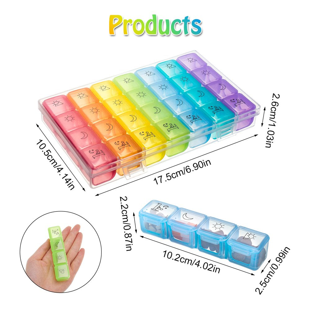 - True Large Capacity: Each compartment can hold about 8 fish oil pills or large vitamin tablets, and the product measures 6.9in x 4.14in x1.03 in. 7 colors are used to distinguish 7 days a week, and each removable box has 4 compartments to use, which can put enough supplements or prescription drugs.