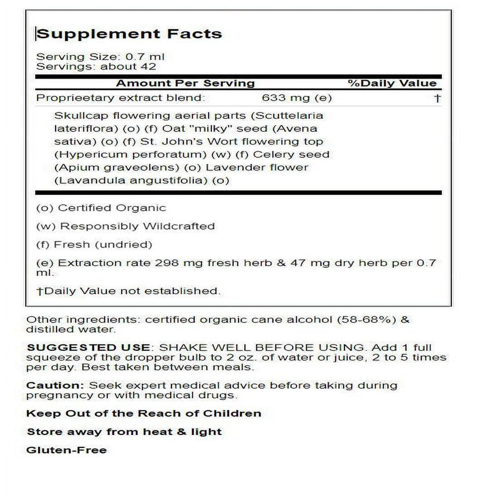 Nervous System Tonic features Skullcap extract prepared from fresh (never dried) Scutellaria lateriflora plants grown on fields we farm in southern Oregon. It also features Oat Seed extract prepared from the fresh (never dried) seed of Avena sativa grown on our own Certified Organic farms.