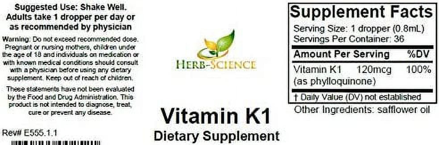 Herb-Science Liquid Vitamin K1 Drops, 1 Fluid Ounce, Supports the Blood, Bones, Intestines, Liver, Skin. Alcohol Free is backordered and will ship as soon as it is back in stock.