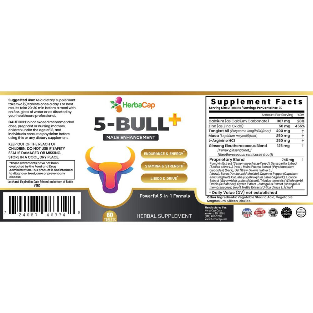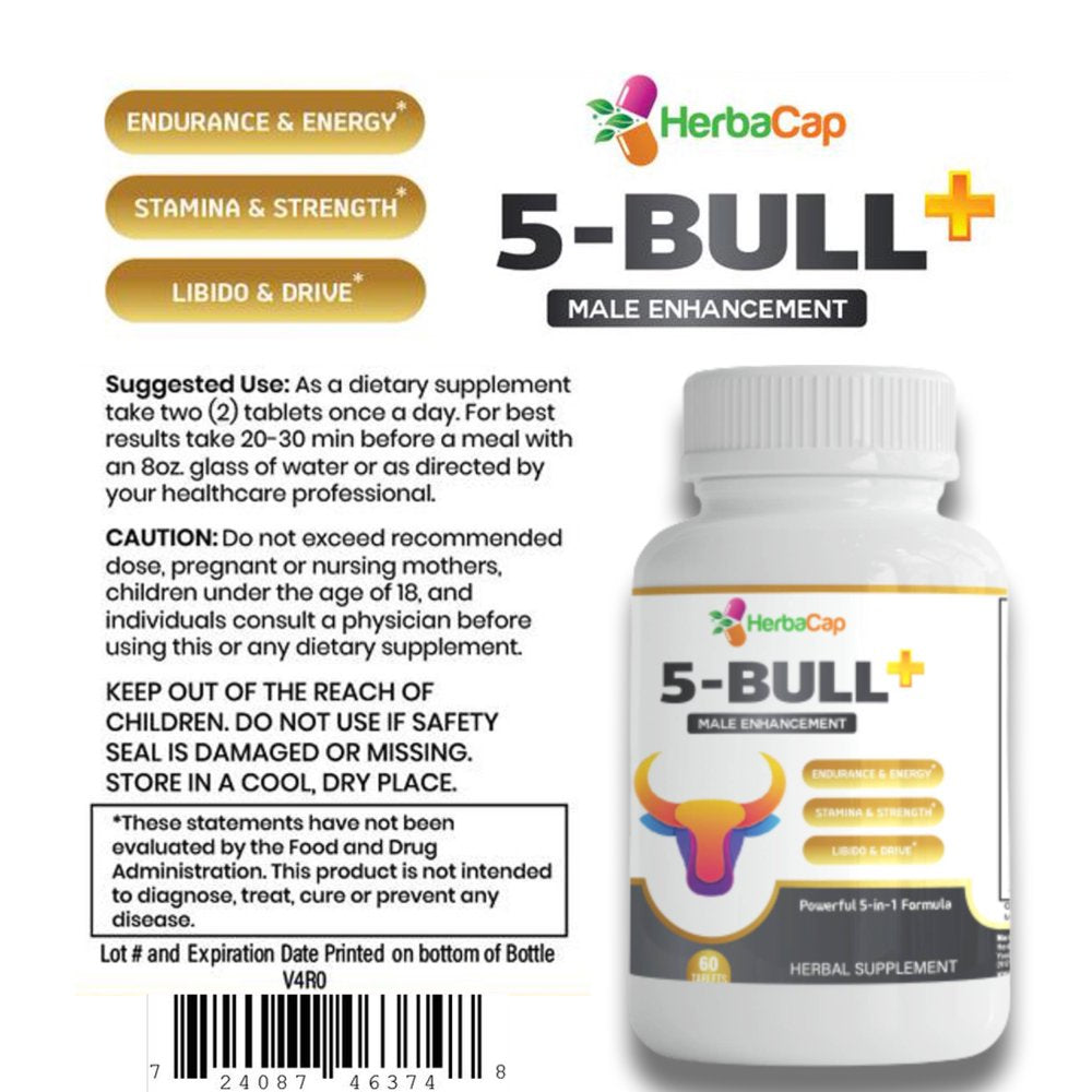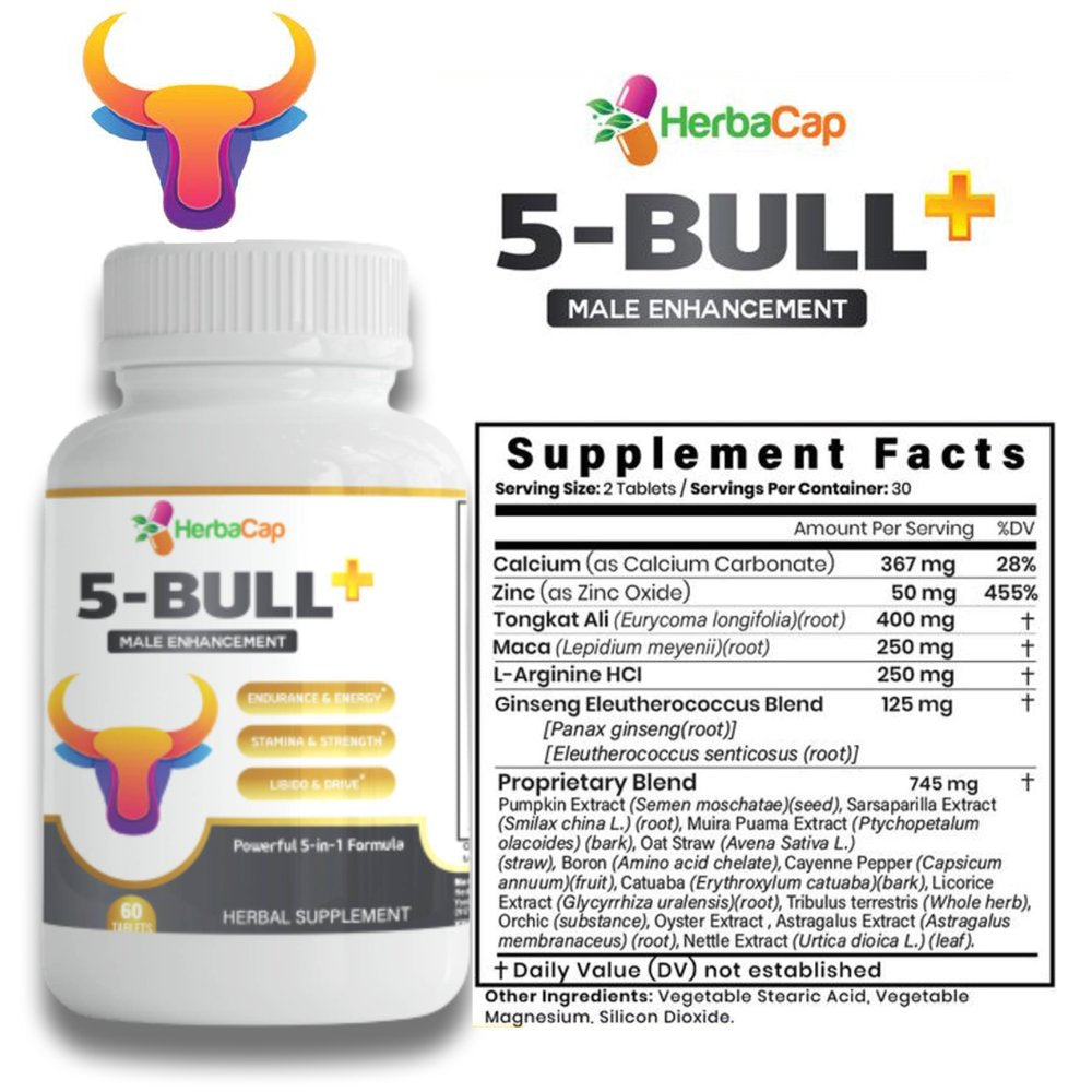 - HerbaCap 5 BULL Plus is a natural herbal supplement for male enhancement, formulated to help men achieve their performance goals. The 5-in-1 formula contains carefully selected natural herbs to boost energy, stamina, and performance without harsh chemicals or prescription medications. This supplement supports male vitality and overall wellness, promoting a healthier and more satisfying lifestyle. It is suitable for men of all ages who want to improve athletic performance, feel more energized, and gain greater confidence. Each bottle contains 60 capsules, providing a generous supply for long-term use. The supplement is manufactured in a certified facility to meet high standards of safety and efficacy. HerbaCap 5 Plus is also backed by a satisfaction guarantee, so you can try it risk-free and experience the natural power of this herbal supplement for male performance, energy, and stamina.