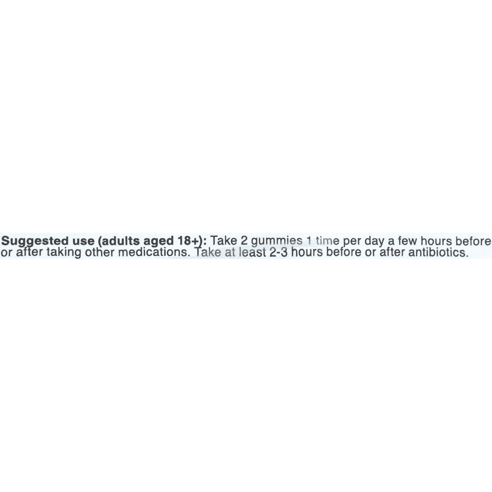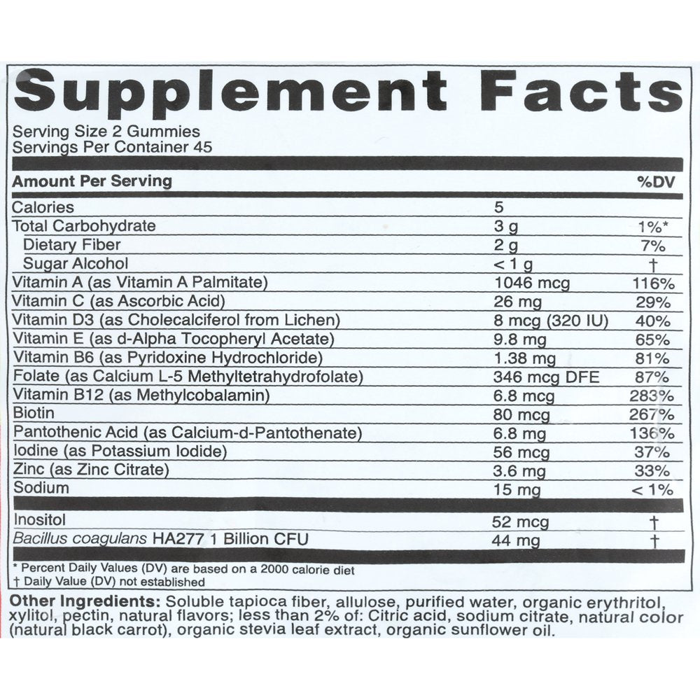 Serving Size 2 Gummies Amount Per Serving (%DV) Calories 5 Total Carbohydrate 3 g 1%* Dietary Fiber 2 g 7% Sugar Alcohol < 1 g † Vitamin A (as vitamin A palmitate) 1046 mcg 116% Vitamin C (as ascorbic acid) 26 mg 29% Vitamin D3 (as cholecalciferol from lichen) 8 mcg (320 IU) 40% Vitamin E (as d-alpha tocopheryl acetate) 9.8 mg 65% Vitamin B6 (as pyridoxine hydrochloride) 1.38 mg 81% Folate (as calcium L-5 methyltetrahydrofolate) 346 mcg DFE 87% Vitamin B12 (as methylcobalamin) 6.8 mcg 283% Biotin 80 mcg 267% Pantothenic Acid (as calcium-d-pantothenate) 6.8 mg 136% Iodine (as potassium iodide) 56 mcg 37% Zinc (as zinc ctitrate) 3.6 mg 33% Sodium 15 mg < 1% Inositol 52 mcg † Bacillus coagulans Rosell-449 1 Billion CFU 44 mg † *Percent Daily Values (DV) are based on a 2000 calorie diet †Daily Value (DV) not established/div>
