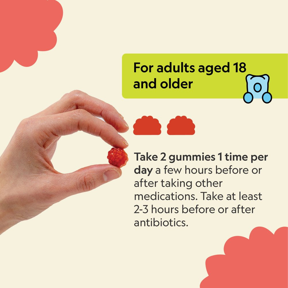 These sugar-free raspberry passion fruit Multi + Probiotic gummies contain 12 essential vitamins and minerals and one billion CFU of B. Coagulans Rosell-449 probiotics to support the health of your digestive tract and overall daily health and wellness needs. The benefits are - Containing 12 essential vitamins and minerals and one billion CFU of B. coagulans Rosell-449 probiotics. - Supporting the health of your digestive tract and overall daily health and wellness needs. Suggested Use (Adults aged 18+): Take 2 gummies 1 time per day a few hours before or after taking other medications. Take at least 2-3 hours before or after antibiotics. Take only as directed. Do not exceed suggested dosage. Chew thoroughly before swallowing. Keep out of reach of children. Do not use if the safety seal is broken or missing. Store in a cool & dry area, away from direct light.