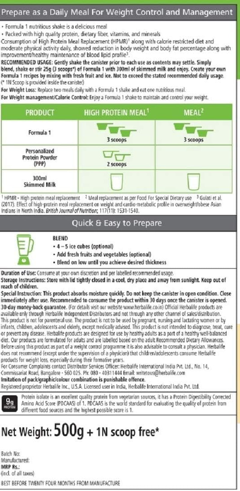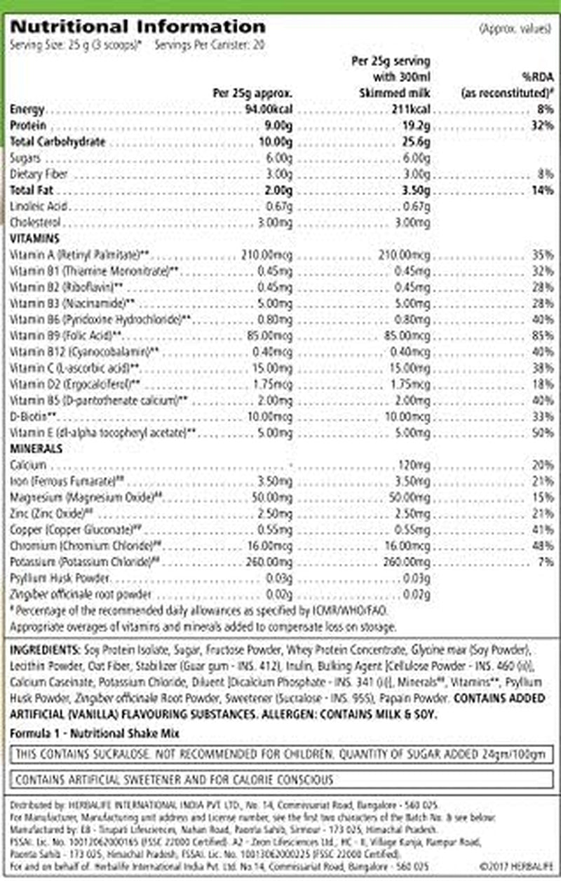 Herbalife Formula 1 Nutritional Shake Mix Vanilla makes a great tasting shake, specifically formulated with all necessary quality soy protein isolate, as Nutritional Food product for nutritional requirements. Packed with vitamins & minerals along with natural herbs, antioxidants, and dietary fiber, it provides desired protein and nutrition without overloading unnecessary fat and calories. One serving of Formula 1 shake mix provides 90 kcals of energy. Enjoy Formula 1 shakes once or twice a day along with portion-controlled nutrition and exercise to help towards keeping the body fit.