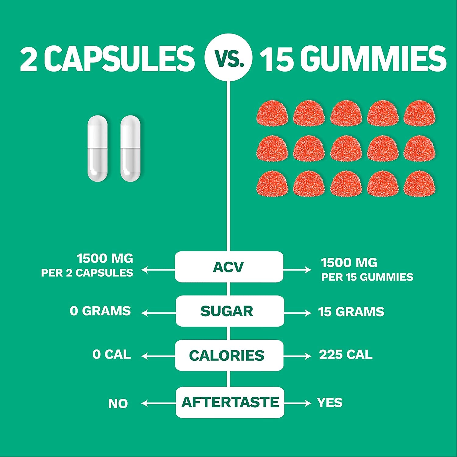 Two capsules of Herbtonics Raw Apple Cider Vinegar (one serving size) has 1500mg of apple cider vinegar, which is equal to 4 liquid teaspoons.
