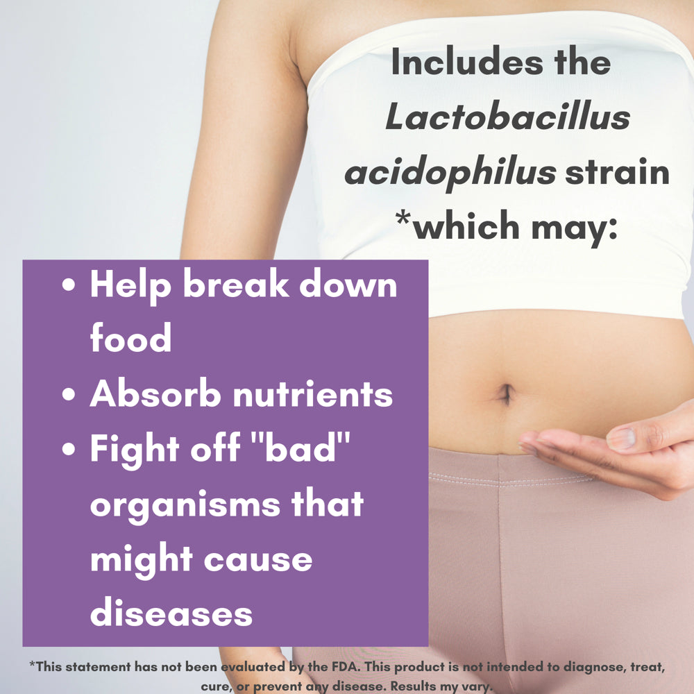 - Includes Lactobacillus acidophilus and Bifidobacterium strains that protect the body against infections