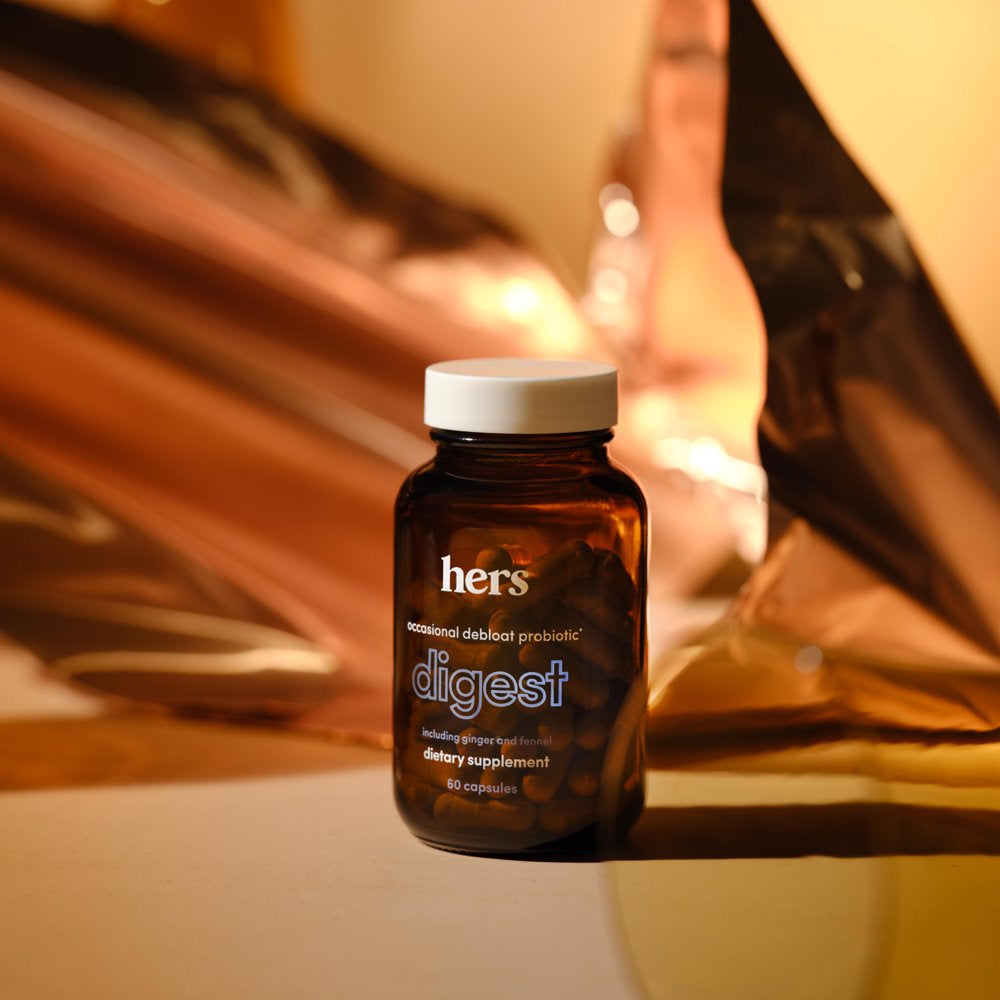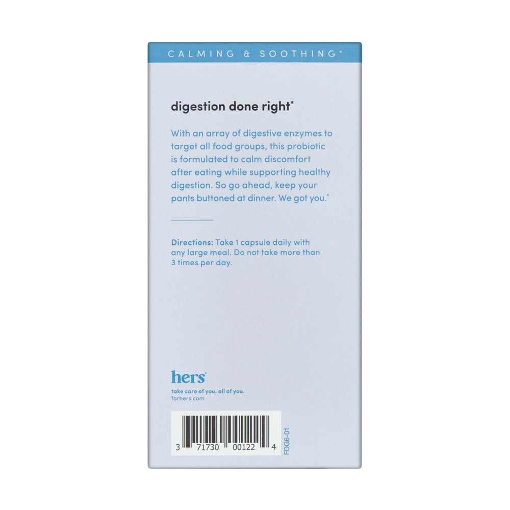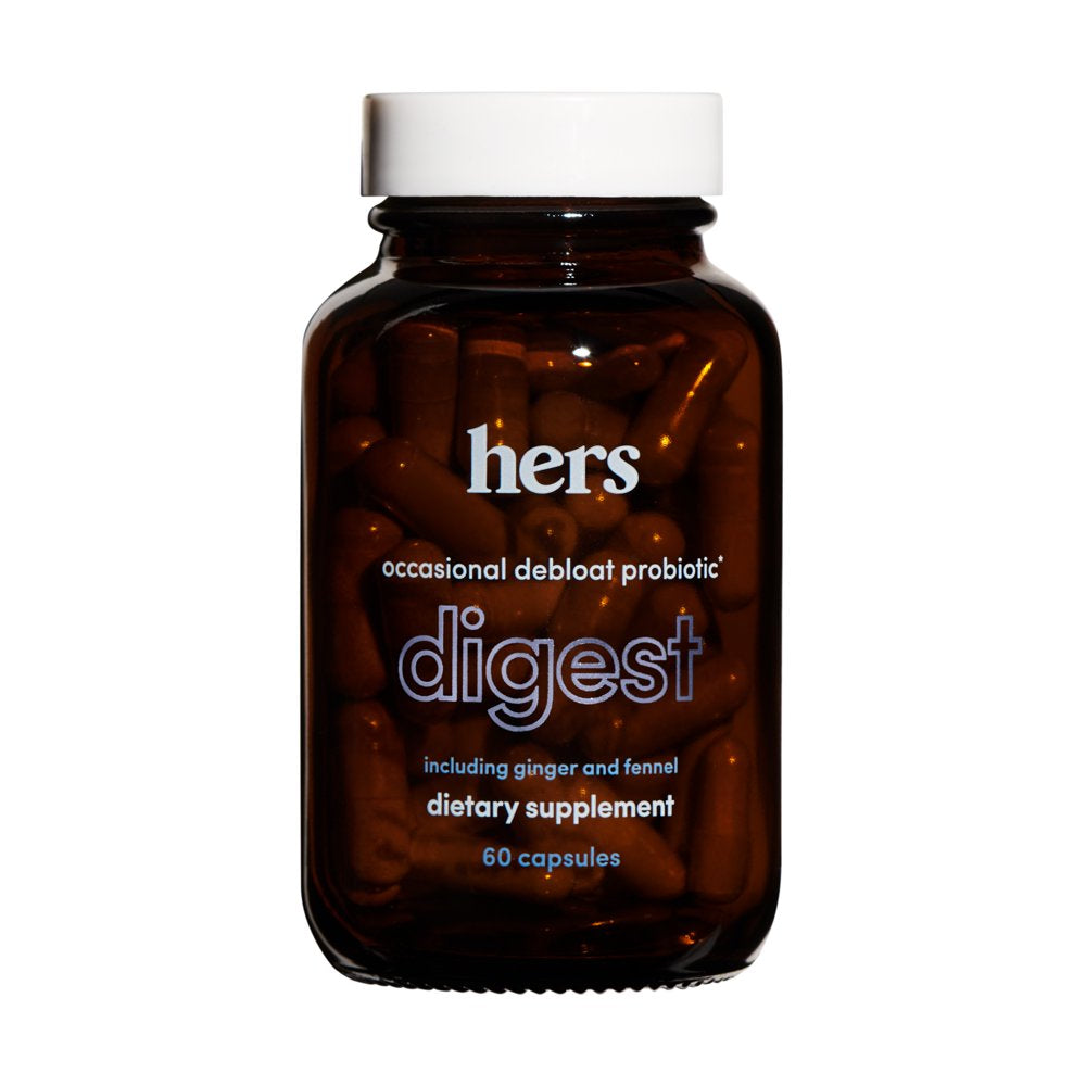 Digestion discomfort? Let’s break it down. This daily supplement is formulated with a range of digestive enzymes to directly target all food groups, making it the perfect way to calm bloat and general irritation after eating and support regular, healthy digestion. Hers Digest Debloat Probiotic Supplement tackles the most common digestive concerns for women by calming intestinal irritation and bringing down bloat. Our probiotic contains digestive enzymes to calm discomfort after eating by helping to process undigested food. Fennel soothes gastrointestinal muscles to support easy digestion. Ginger and peppermint help with bloating and gas relief by relaxing the digestive tract. Includes one month supply of 60 capsules (serving size 2 capsules).