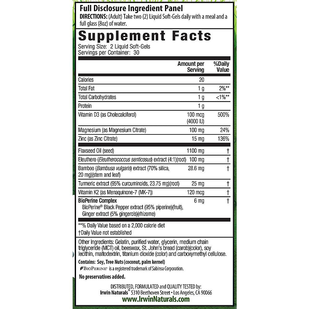 Bone Health: This robust formula delivers the most sought-after bone health essentials, including Vitamin D3, Vitamin K2 (as MK-7), Magnesium, Zinc, and Bamboo Extract, which supplies Silica ? an essential component of healthy bones.* Immune Support: Vitamin D3 and Zinc play critical roles in maintaining a healthy immune response.* These are combined with Turmeric extract and Eleuthero ? both known traditionally for immune-bolstering effects.* Mood Regulation: Emerging research suggests that Vitamin D3, known as the "Sunshine Vitamin?, may be involved in mood regulation.* The adaptogen, Eleuthero, is also included for its traditional use in mood support.*