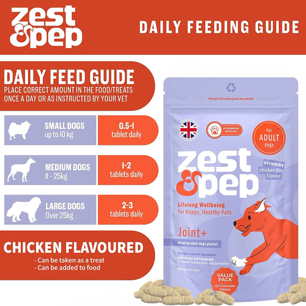 Zest & Pep adult dog joint supplement is tailored to support healthy joints and promote mobility in adult dogs aged 2 to 7. A daily serving of Joint+ Adult joint care supplement helps to keep canine joints healthy and flexible during their daily activities. Our adult dog joint supplement comes in a delicious chicken flavor that your buddy will LOVE! Zest & Pep joint supplement for dogs is developed by our brilliant pet nutritionists using science-based research to keep your friend in tip-top condition. Our dog joint health supplements contain NO artificial preservatives, colours, or flavorings. Each bottle contains 120 tasty chicken-flavored dog joint supplements.