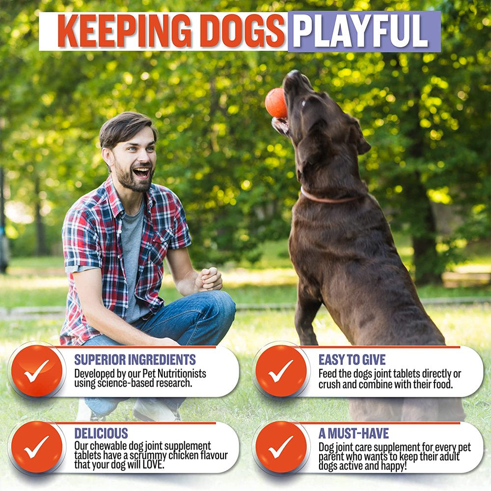 - DELICIOUS TASTE, EASY TO GIVE: From a brand that cares about pets, our senior dog joint supplement comes in a delicious chicken flavor that your buddy will LOVE! All 120 tasty dog joint supplements contain active ingredients that work to support overall joint health and happiness for all breeds of senior dogs. See the Feeding Guide infographic for recommended daily tablets serving small, medium, and large dog breeds.