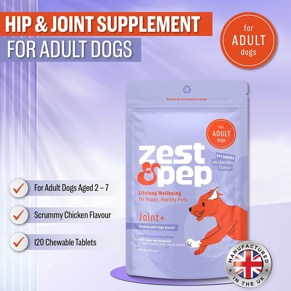 - SUPPORTS JOINTS AND MOBILITY: Zest & Pep senior dog hip & joint supplement is tailored to support healthy joints and promote mobility in senior dogs aged 7 or older. A daily serving of Joint+ Senior joint care supplement supports your dog's older joints, helps to reduce stiffness, and eases any discomfort. Our dog joint care supplement is tailored to support aging joints by promoting long-term mobility, easing joint discomfort, and stiffness, and supporting flexibility.