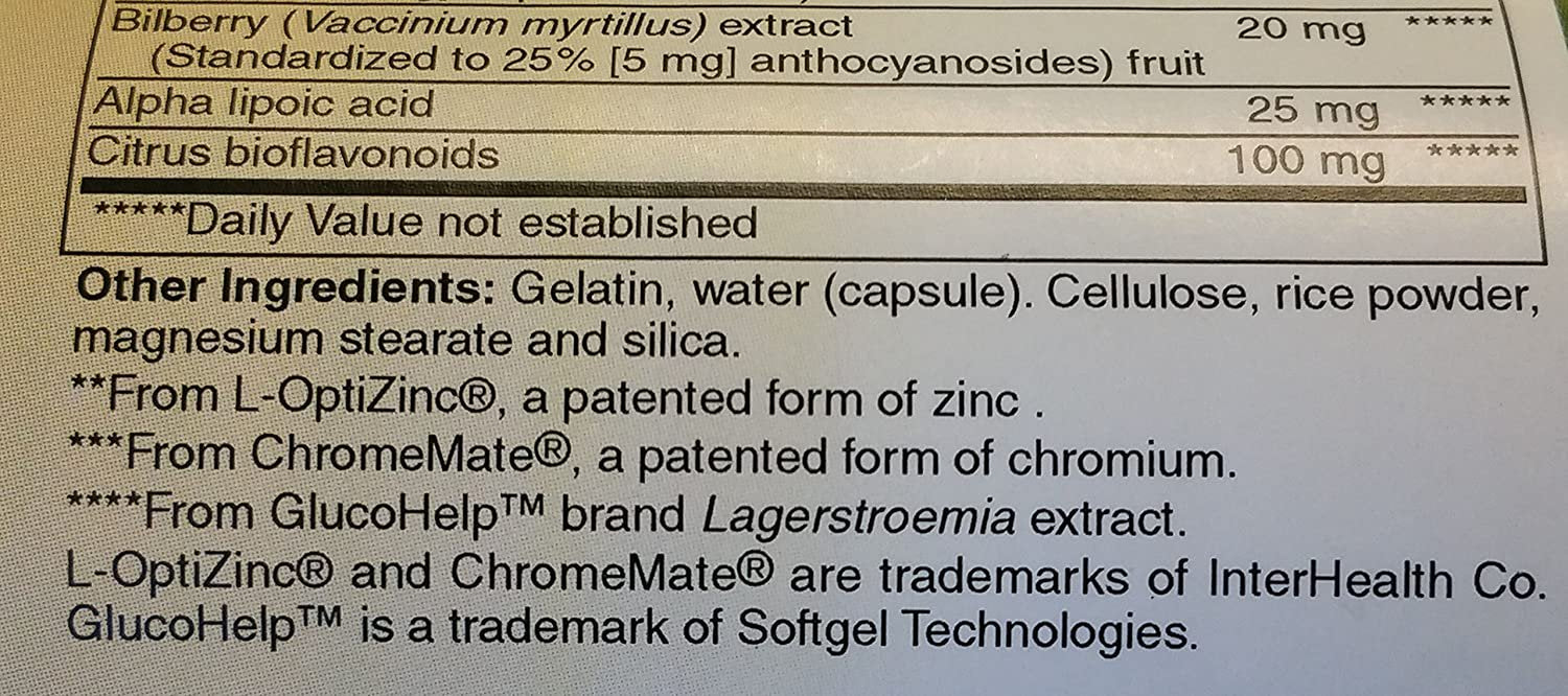 - Contains several branded and trademarked ingredients such as GlucoHelp, L-OptiZinc and ChromeMate, all of which have numerous scientific studies to support their efficacy and safety. Contains synergistic ingredients such as alpha lipoic acid, gymnema sylvestre, ginkgo biloba and milk thistle, all of which provide support for abnormal glucose metabolism.