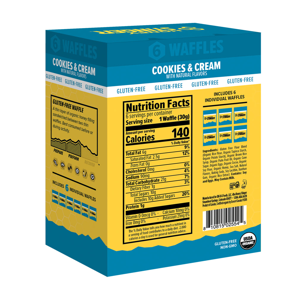 Honey Stinger Individual Healthy Organic Gluten Free Snack Waffle, Cookies and Cream (6 Count), make a great tasting snack. Chocolate lovers and vanilla purists unite in the classic flavor combo of Cookies & Cream. A vanilla cream flavored filling gets sandwiched between two chocolate crispy thin waffles for a perfect union. For years, similar waffles have been sold on street corners throughout Europe and eaten by professional cyclists, so we decided to create our own by sandwiching honey between two thin waffle wafers. Honey Stinger Organic Waffles are the only product of their kind that's certified organic and available in a single-serving wrapper.