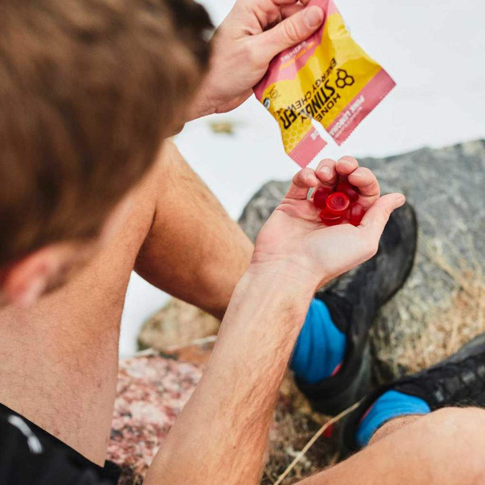 Honey Stinger Organic Energy Chew, Pink Lemonade (1.8 ounce/ 12 count) - enjoy the taste of summer all year long. Using natural pink lemonade flavors to create the perfect mixture of sweet and tangy that everyone loves. Sweetened with organic honey and tapioca syrup, these chews provide a natural and sustainable source of energy with multiple carbohydrate sources: glucose, fructose, maltose and sucrose. Each box contains 12 individually wrapped packs. With 23g carbs per serving to replenish glycogen stores and ingredients intended for quick uptake, energy chews are the perfect portable fuel to keep you going without weighing you down.
