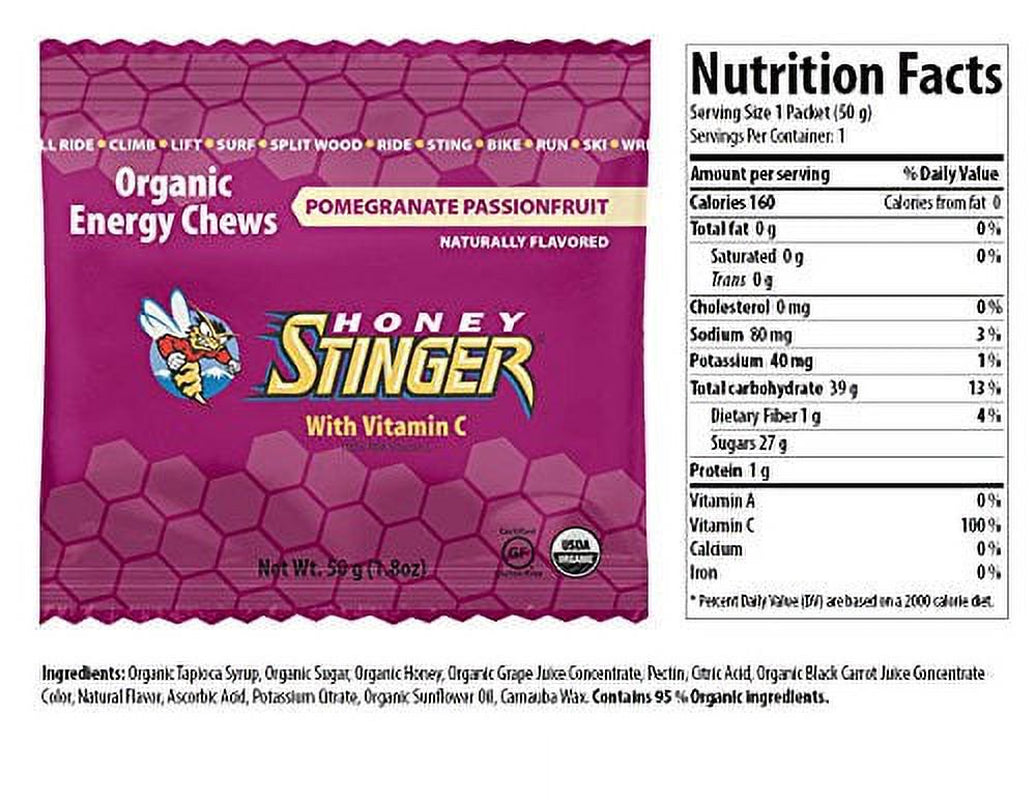 - Pure natural energy. USDA organic. Ski. Wrestle. Fish. Bull ride. Climb. Lift. Rip. Surf. Split wood. Ride. Sting. Run. 100% RDA of vitamin C. Contains electrolytes. Dairy free. Gluten free. 0% trans fat. At Honey Stinger we make our organic energy chews from the finest natural ingredients. Our fruity chews offer 100% of the RDA for vitamin C blended with organic honey and organic tapioca syrup which contains both protein and fiber. They'll keep you running! Thanks from the Crew at Honey Stinger. Contains 95% organic ingredients. With vitamin C and electrolytes. - The Crew at Honey Stinger. Certified organic by QAI. Made in the USA.