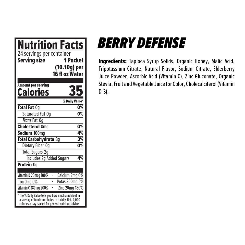 RECOVER: Post-activity replenishment with immunity boost. Hydrate with a smooth mix of blueberry, blackberry, strawberry, and elderberry flavors with a tart, yet sweet finish. Shall we say it’s berry delicious FUEL FOR EVERY ACTIVITY: Replenish fluid and electrolyte losses post-exercise. Deliver hydration to your bloodstream faster and more efficiently than water alone IMMUNE SYSTEM BENEFITS: Support the immune system with the benefits of zinc, elderberry, and vitamins C and D. Optimize hydration with our 1:3 sodium to potassium ratio CONVENIENT REHYDRATION: Honey Stinger Rapid Hydration Mix come as single serving, travel-friendly packets, easy to enjoy on-the-go. Pour one easy-to-open packet into 16oz of water, mix or shake, and hydrate Honey Stinger’s complete 3-Part Rapid Hydration System provides specific formulas to help you PREPARE, PERFORM, RECOVER with energizing honey-powered fuel Each pouch contains 24 packets