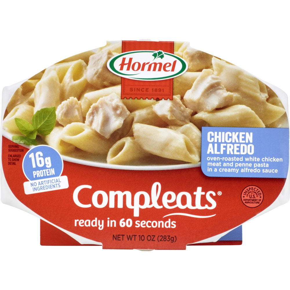 - HORMEL COMPLEATS Chicken Alfredo has oven-roasted white meat chicken and penne pasta in a creamy Alfredo sauce. Regular size