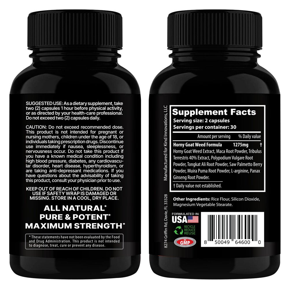 If you're looking for an all-natural fast acting sexual health supplement for increased blood flow, libido for woman, and energy, horny goat weed is for you. Horny goat weed for men and women is natures best libido supplement and sexual enhancement pills. Our powerful blend includes horny goat weed, ohimbine, Maca Root, Ginseng, Saw Palmetto, L Arginine, and Tribulus. Natures all-natural aphrodisiac in an easy to swallow pill supplement form. Don't let the name fool you, these supplements are not just for male enhancement or pills for men erection, they are also designed for the sexual wellness women. Start the day with increased blood flow and an increase sex drive for women and men sexul health supplements. Our specially formulated male and female libido booster pills only contain pure ingredients without additional unnecessary substances. The easiest addition to your daily routine with fast results. This specially formulated blend promotes healthy blood flow regulation and are not just horny pills for men or women. The best replacement for viagra pills for men and also womens viagra. Stop taking poppers sex stimulants and go the safe and natural way with horny goat weed.