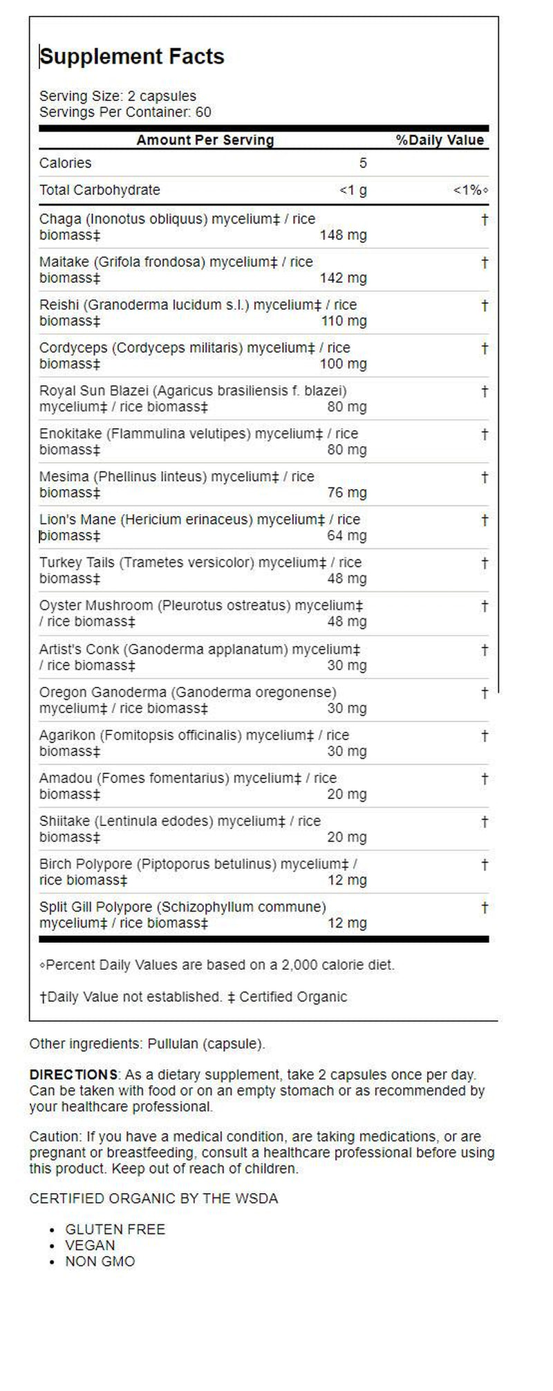 MyCommunity® is the 17-Species Multi Mushroom Complex originally created by Paul Stamets ¹a comprehensive Host Defense® formula for Supporting Natural Immunity.* Host Defense® MyCommunity® uses activated, freeze-dried, Certified Organic mushroom mycelium and fruitbodies, with a full spectrum of constituents: >55% (550mg/serving) polysaccharides, .5% (5mg/serving) fatty acids, and an array of extracellular constituents, including enzymes, antioxidants and prebiotics for the microbiome, essential for Supporting Natural Immunity.*