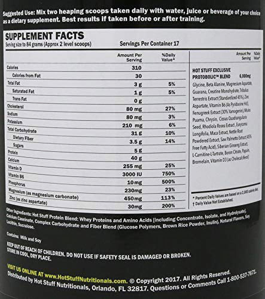 Dietary Supplement. Anabolic Activator. 80g Protein per 2 Servings. Contains 55 popular bodybuilding supplements! Over 15 years and still going strong! Perhaps the greatest thing about Hot Stuff is that it takes the mystery, guesswork and confusion out of using sports supplements. We've achieved this by combining just about every popular bodybuilding product into one delicious high protein super powder. In fact, a daily serving of Hot Stuff is the equivalent of taking over 100 pills. Yes, a whole new world of progress awaits you once you add Hot Stuff to your exercise training program. Blended with Ion-Exchanged and Cross-Flow Microfiltered Whey Protein Concentrate and Whey Protein Isolate; Enhanced with Glutamine Peptides and Branched Chain Amino Acids (BCAA's); Jam packed with oriental herbs; Rich in anti-oxidants; Contains natural energy boosters; Fortified with digestive enzymes; Low in lactose; Great tasting; Mixes instantly by hand; No aspartame, Acesulfame K Potassium or other artificial sweeteners. Texture and color may vary slightly from batch to batch. The various colored flecks in Hot Stuff are from the naturally occurring herbs. Hot stuff may be used by both males and females.