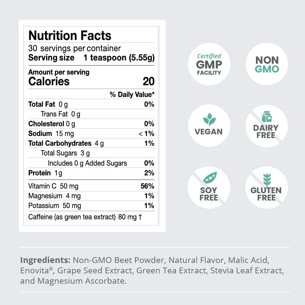 • SuperBeets Energy Plus Powder container contains 30 full servings.