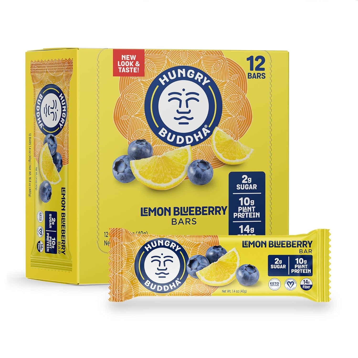HUNGRY BUDDHA Bars - Plant Based Protein Bars - Vegan Nutrition Bars - Low Sugar Healthy Snacks - Gluten Free Snack Bars - Peanut Free - Protein Bar - Keto Bar - 12 Count - [Lemon Blueberry] - Lemon Blueberry is backordered and will ship as soon as it is back in stock.