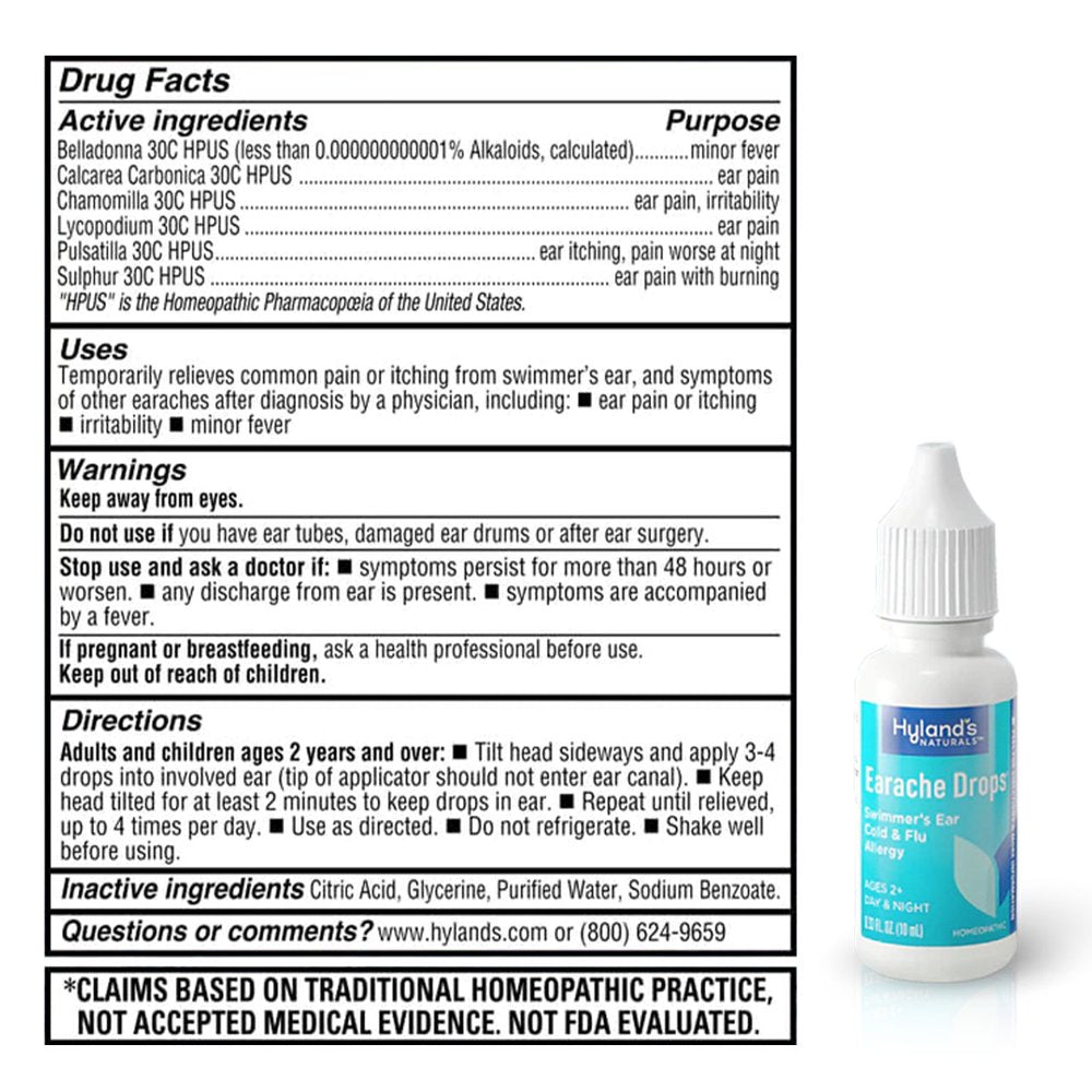 Ear Drops for Swimmers Ear and Allergy Relief for Kids and Adults by Hyland's Naturals, for Clogged Ears, Earaches, 0.33 Ounce. Hyland's Naturals Earache Drops is safe and non-habit forming. Temporarily relieves the symptoms of fever, pain, throbbing, irritability and sleeplessness associated with earaches after diagnosis by a physician Relieves common pain and itching of "swimmers" ear. Dosing dropper for easy delivery into ear to naturally relieve fever, pain, irritability, and sleeplessness associated with earaches in children, after diagnosis by a physician, as well as common pain and itching of swimmer's ear. Up to 150 drops: of Hyland's Naturals Earache Drops. Hylands Naturals is a leading consumer health brand with more than a century of history making high quality products to help people live healthier and happier lives.