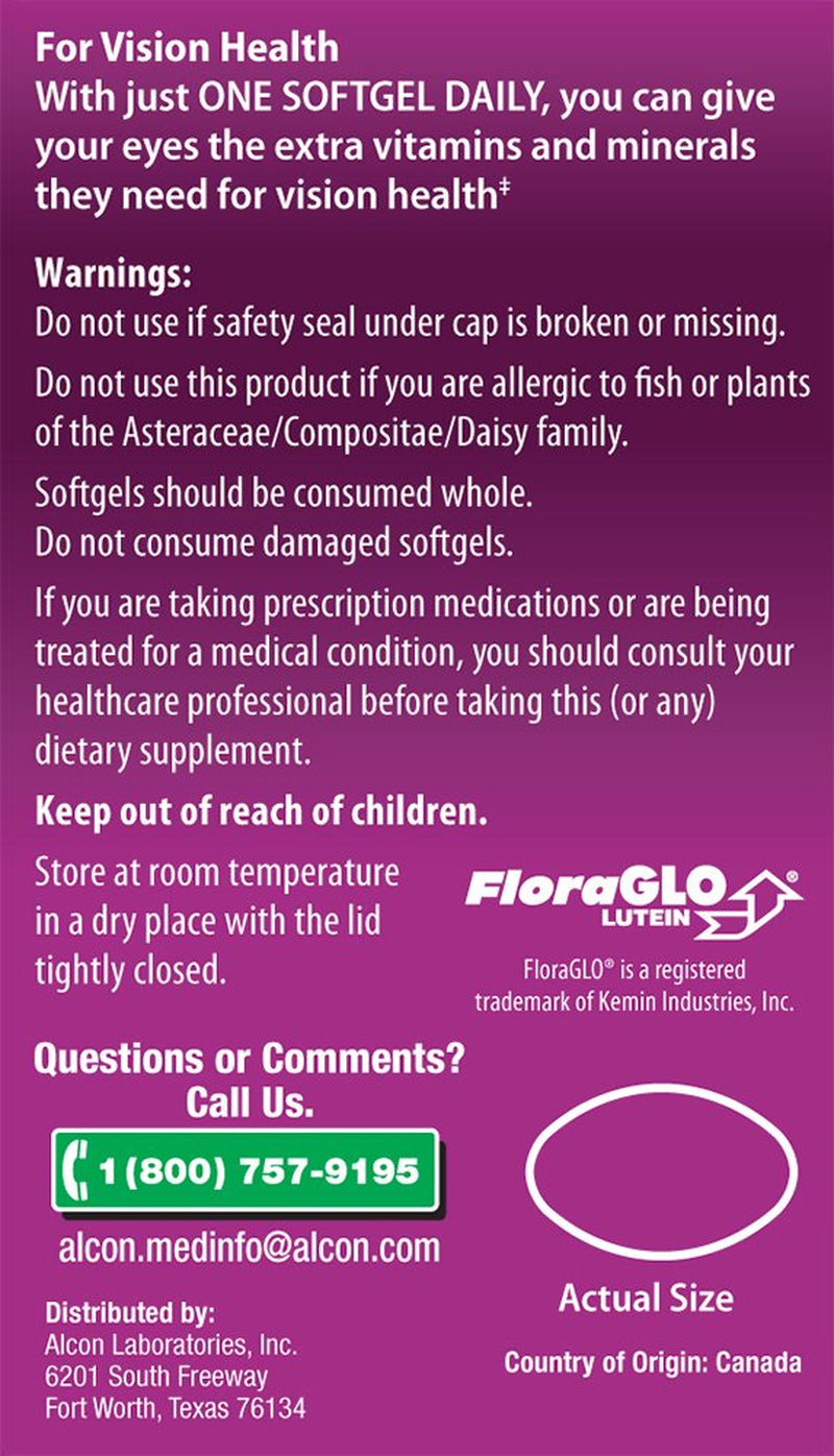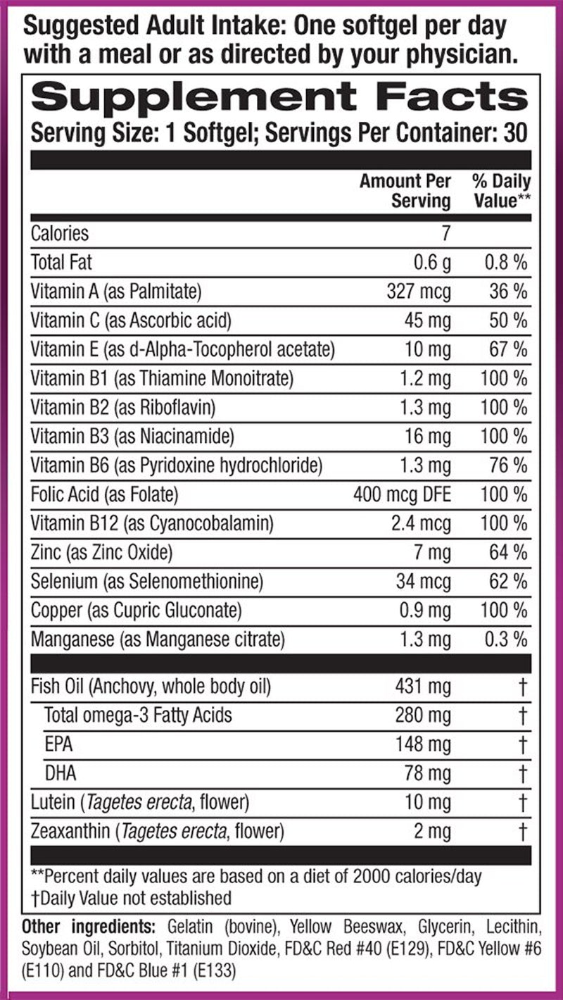 1 Softgel: Calories 10; Total Fat 0.4 g (0.7% *%Daily Value. Percent Daily Values are Based on a Diet of 2000 Calories/Day); Total Carbohydrate 0.03 g (<1%*); Protein 0.32 g (<1%*); Vitamin A (as Retinyl Palmitate) 1090 IU (20%*); Vitamin C (as Niacinamide Ascorbate) 45 mg (75%*); Vitamin E (as d-Alpha-Tocopherol) 10 IU (50%*); Thiamin (as Thiamin Mononitrate) 1.2 mg (80%*); Riboflavin 1.3 mg (76%*); Niacin (as Niacinamide Ascorbate) 16 mg (80%*); Vitamin B6 (as Pyridoxine Hydrochloride) 1.3 mg (65%*); Folic Acid 240 mcg (60%*); Vitamin B12 (as Cyanocobalamin) 2.4 mcg (40%*); Zinc (as Zinc Oxide) 7 mg (47%*); Selenium (as Sodium Selenate) 34 mcg (49%*); Copper (as Copper Gluconate) 0.9 mg (45%*); Manganese (as Manganese Sulfate Monohydrate) 2.3 mg (115%*); Lutein 10 mg (**Daily Value Not Established); Zeaxanthin 2 mg (**); Omega-3 Fatty Acids 280 mg (**) (EPA 148 mg [**], DHA 78 mg [**]); Highly Refined Fish Oil (from Anchovies, Mackerel, and Sardines); Gelatin (Bovine); Beeswax; Glycerin; Sorbitol; Lecithin (Highly Refined Soybean Oil); Silicon Dioxide; Titanium Dioxide; FD&C Red #40 (E129); FD&C Yellow #6 (E110); FD&C Blue #1 (E133)/div>